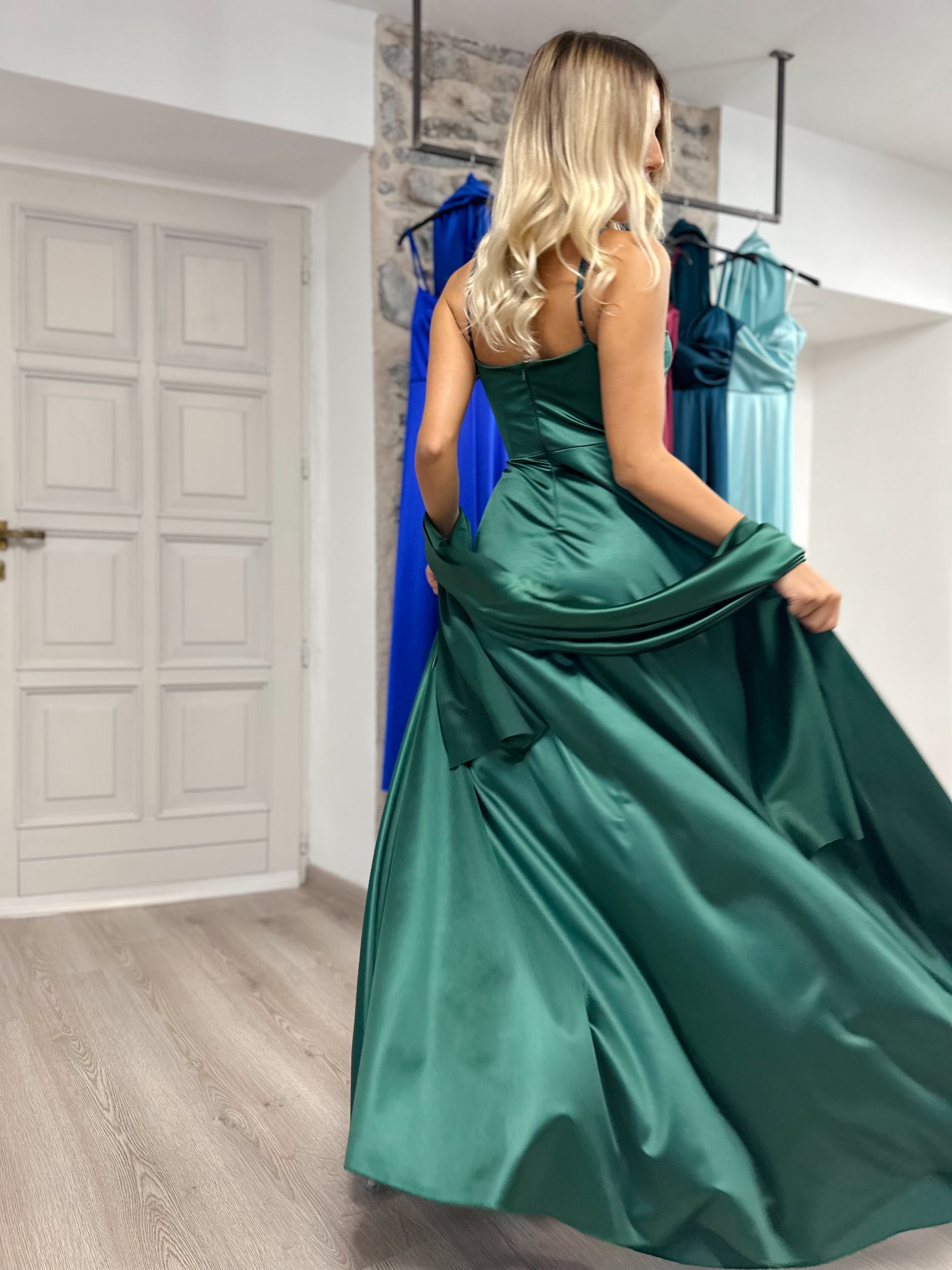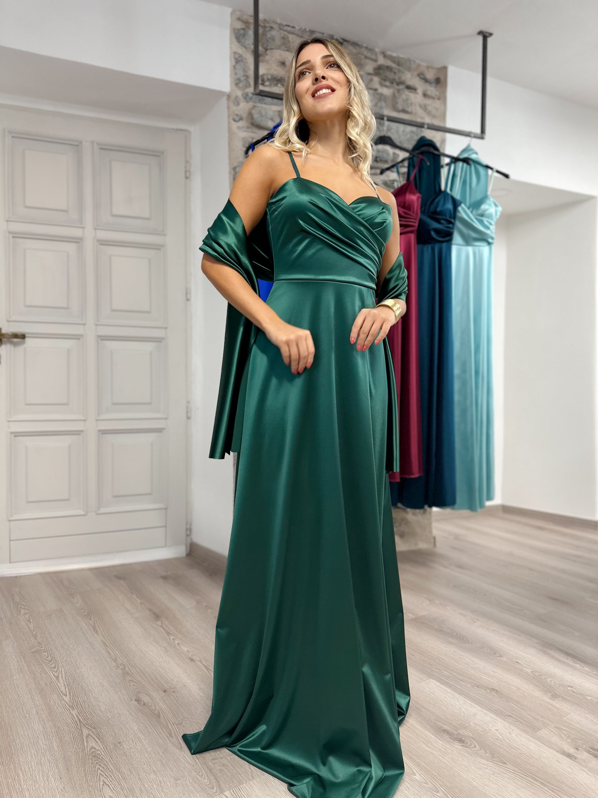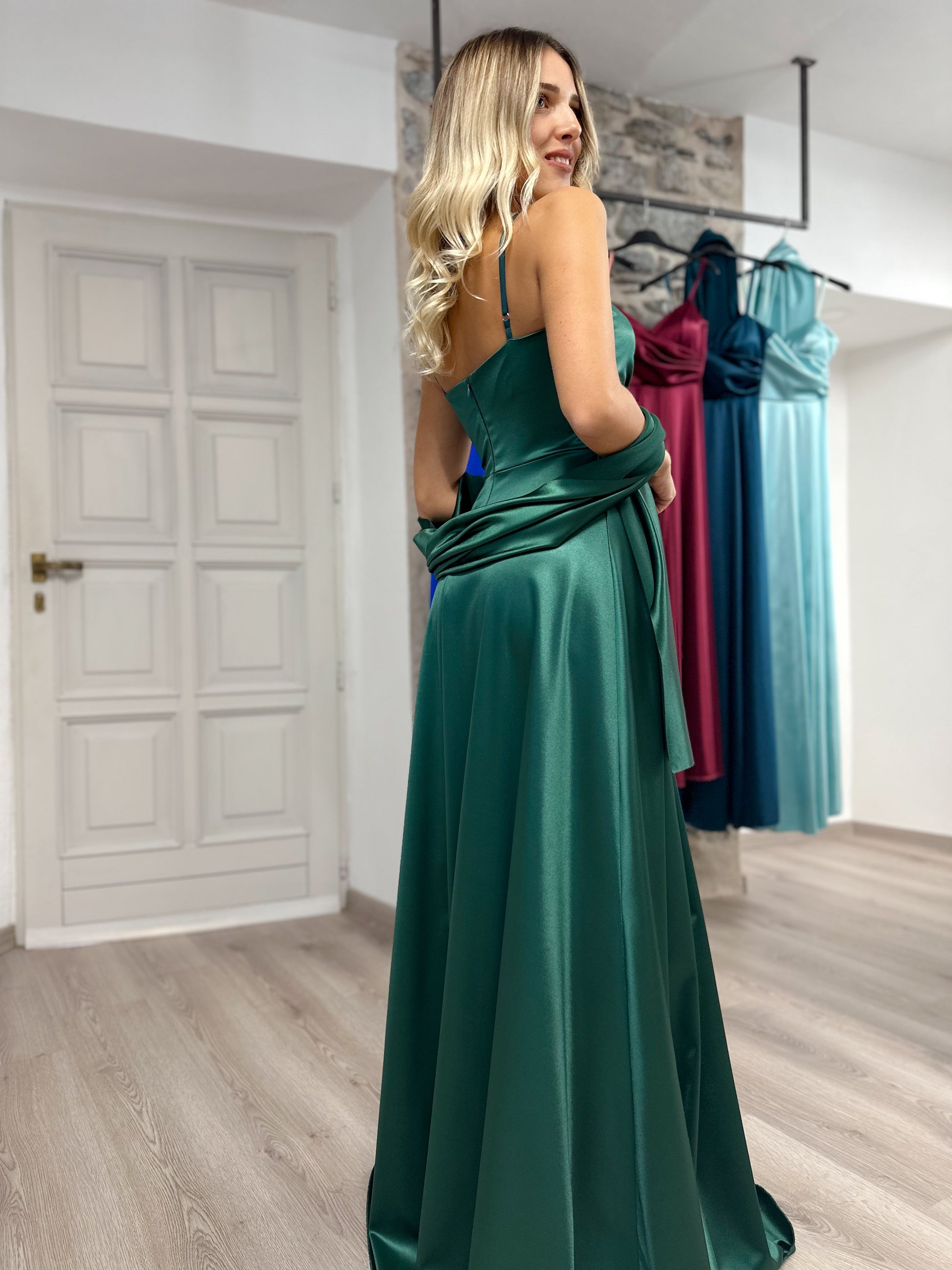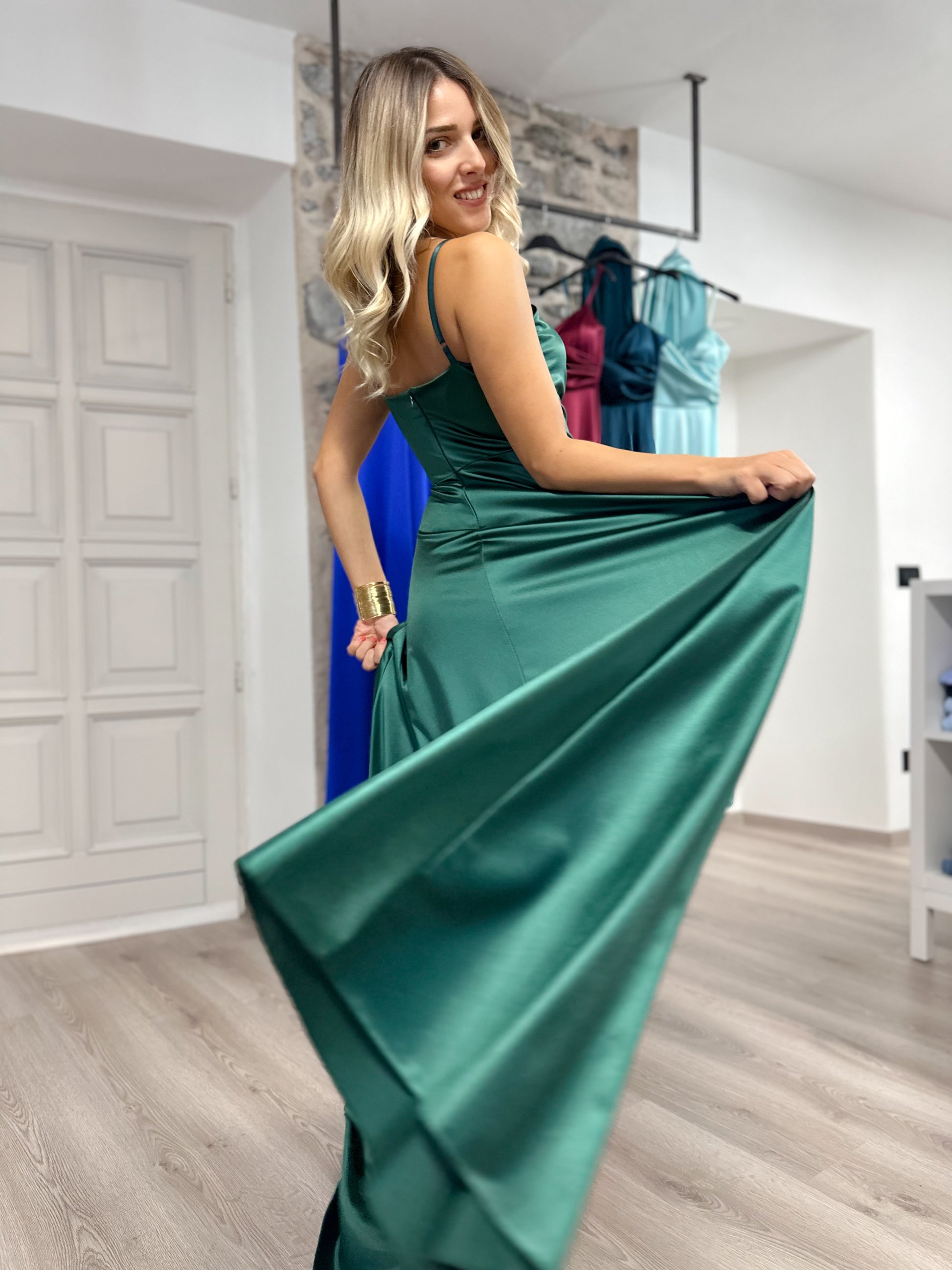 - Abito in satin con scollo a cuore drappeggiato, spalline regolabili, zip sul retro centrale, gonna con ampio spacco