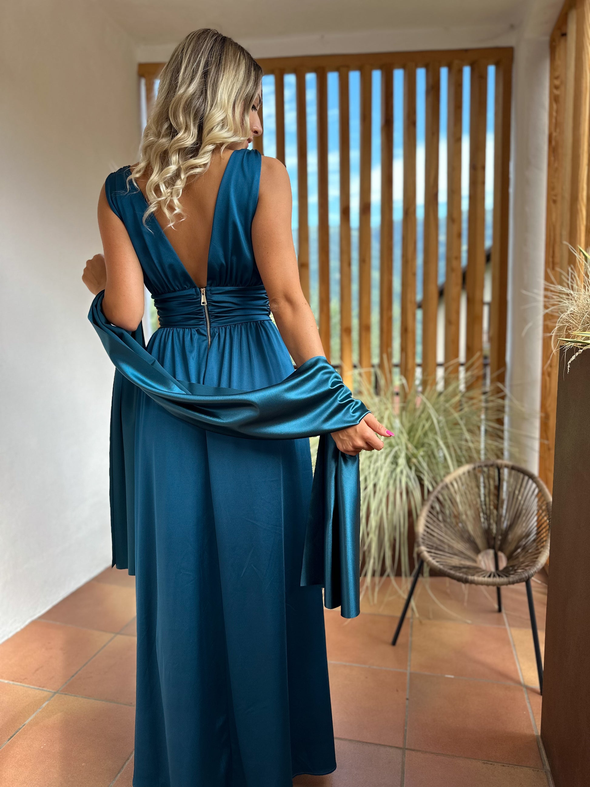 - Abito lungo da cerimonia OTTANIO in tessuto elasticizzato con scollo a V su quattro lati e coppe preformate all’interno