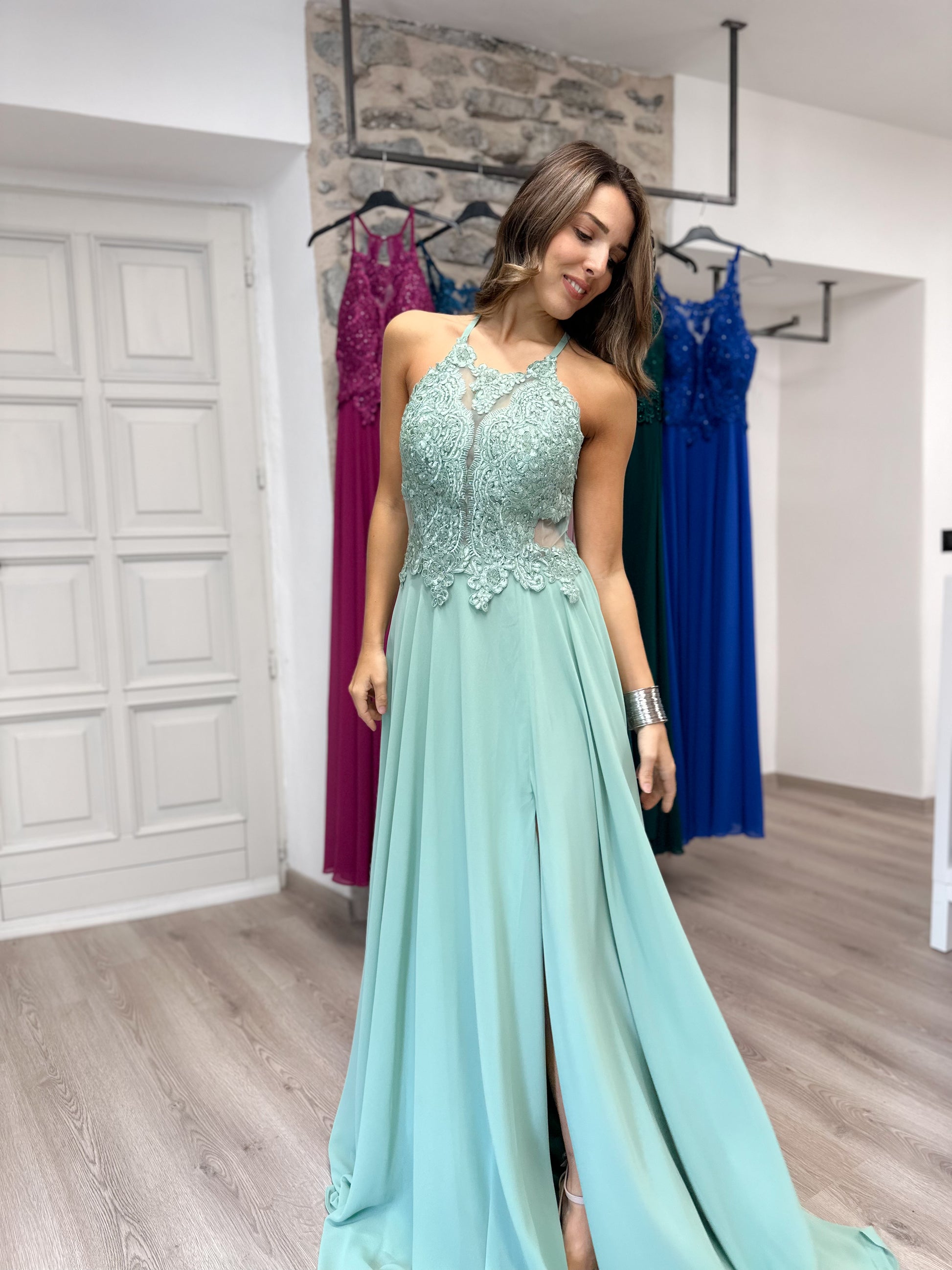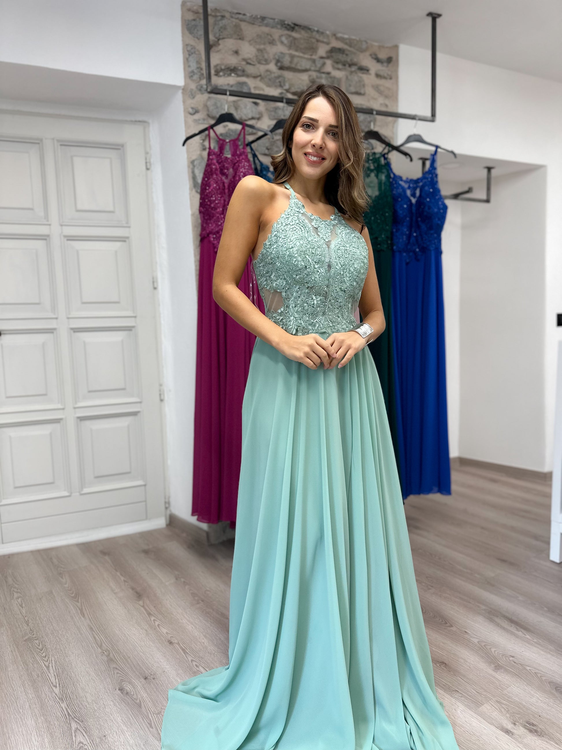 - Abito lungo Top quality con corpetto di pizzo e tulle con strass, gonna morbida con sottoveste fino ai piedi. Chiusura sul retro con zip e fascia elasticizzata. Coppe imbottite internamente