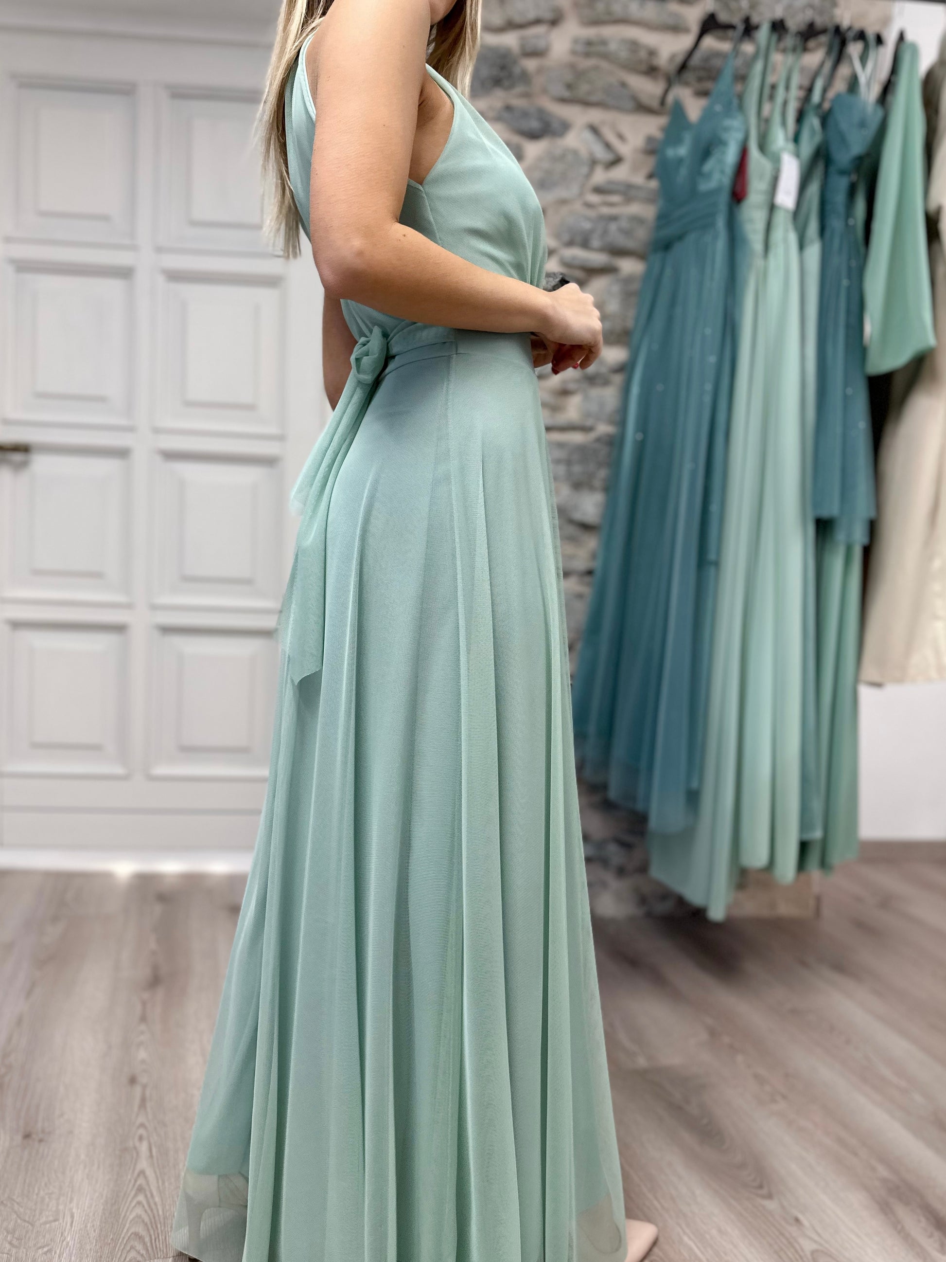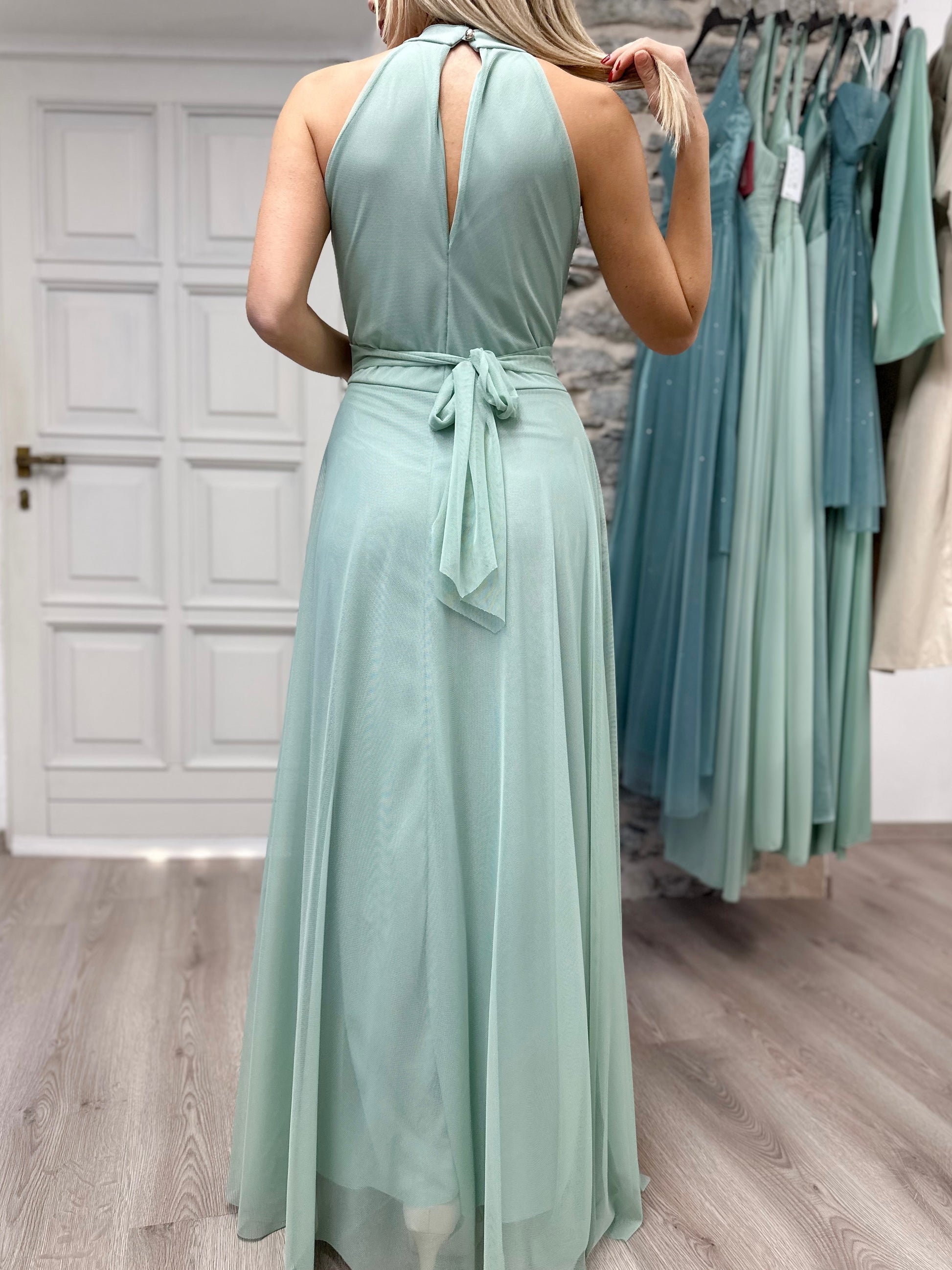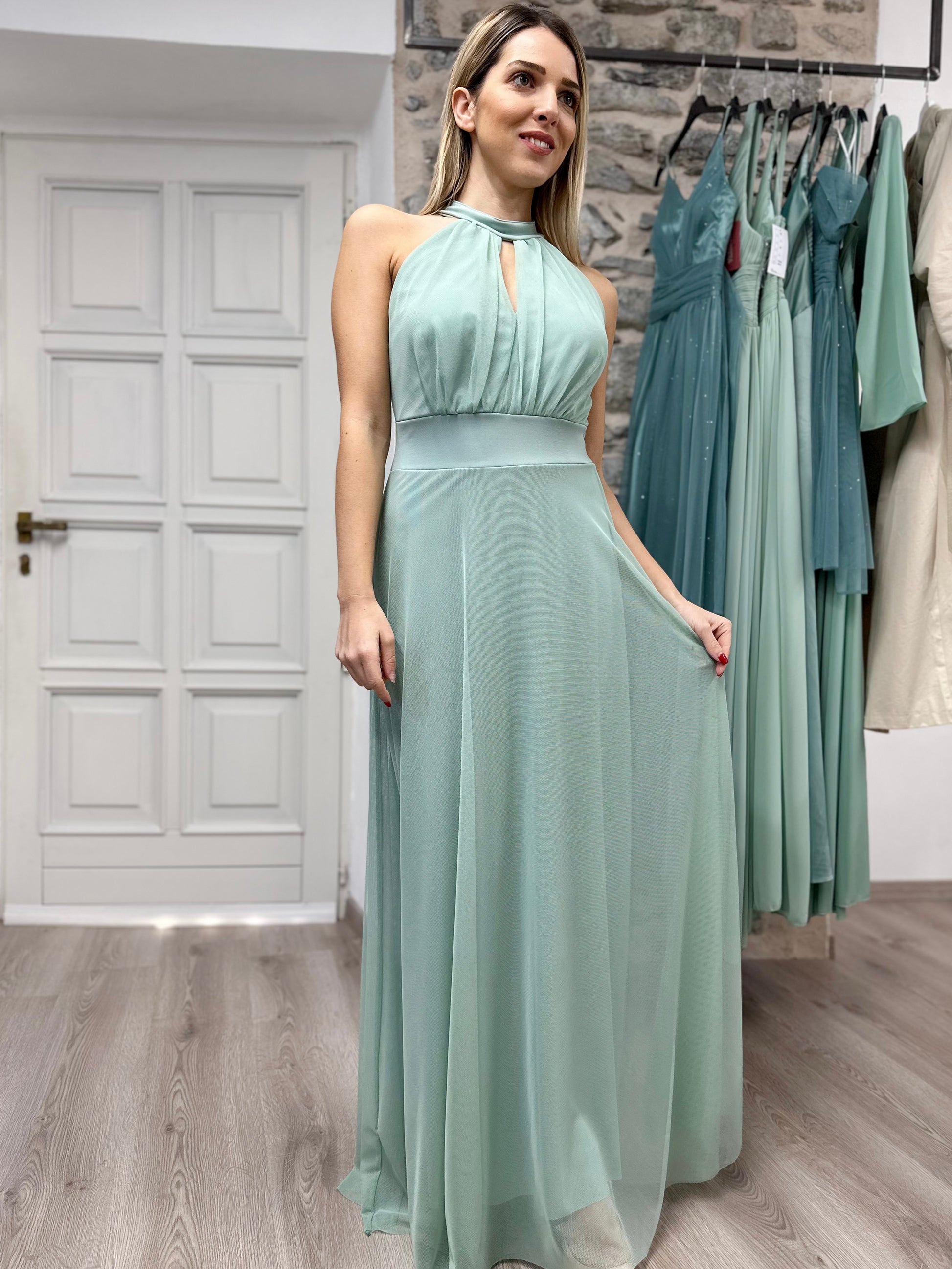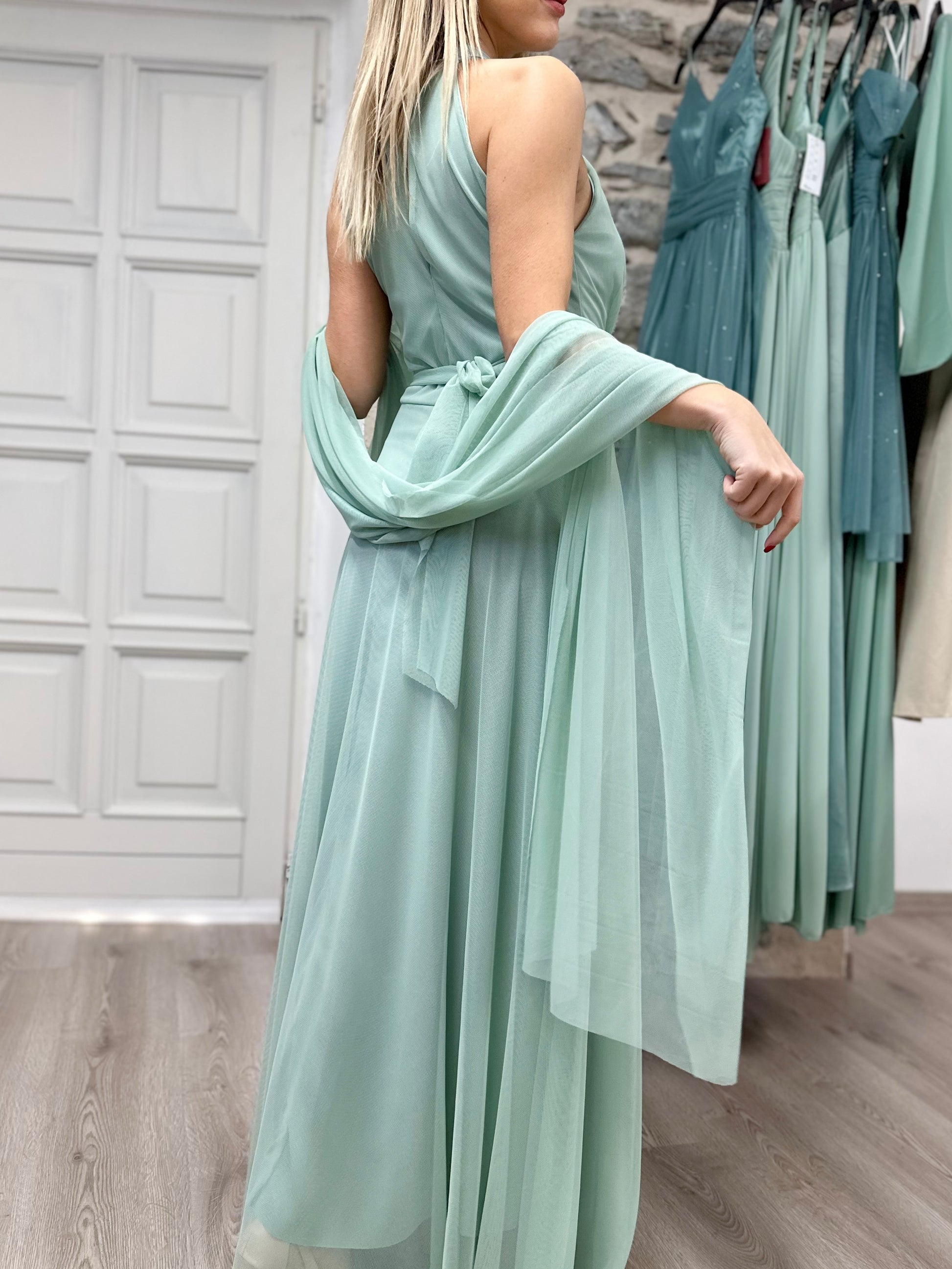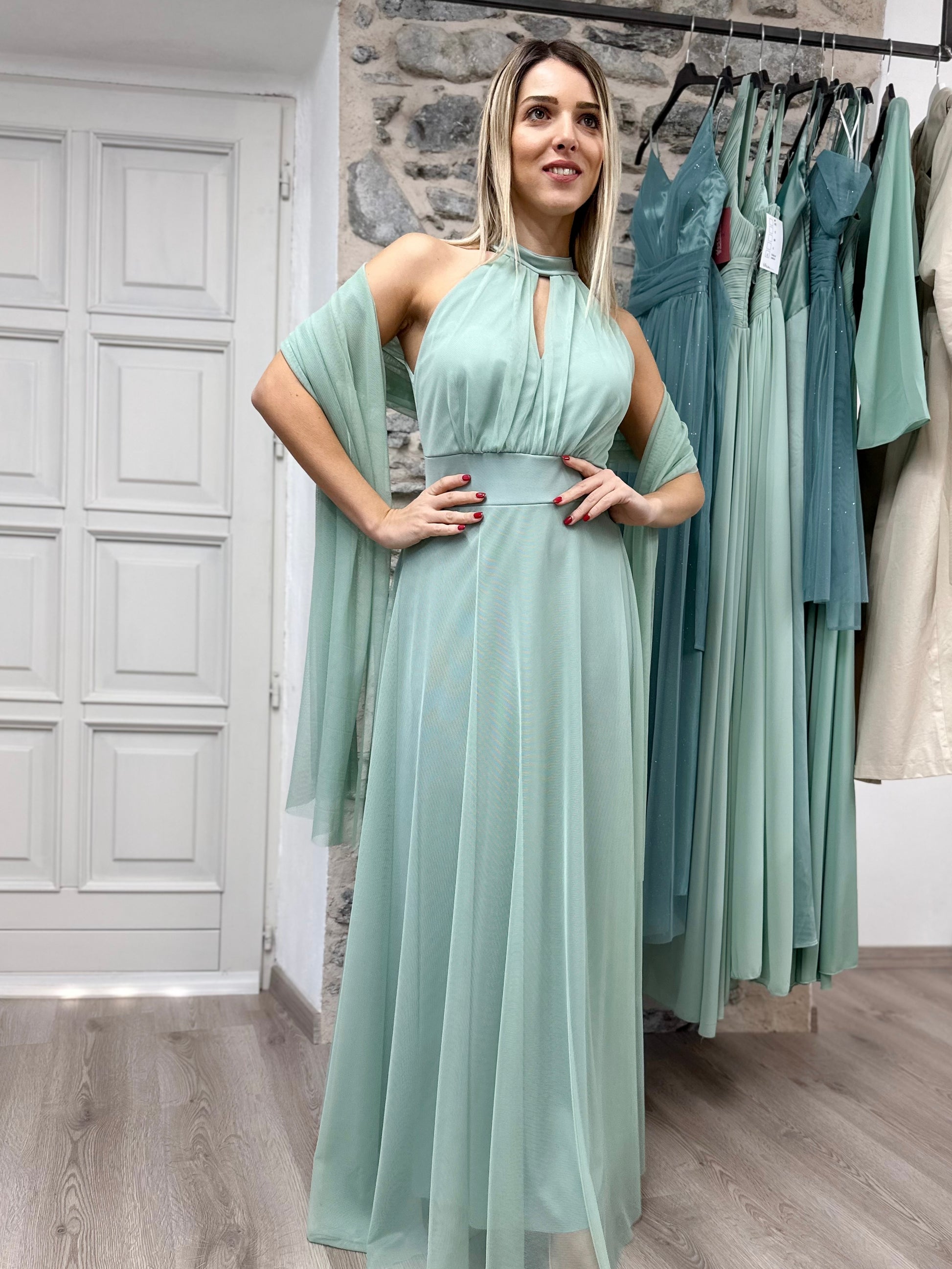 - Abito in tulle con scollo all’americana, bottoncino di chiusura sul retro, coppe preformate. Taglia unica veste fino alla 44