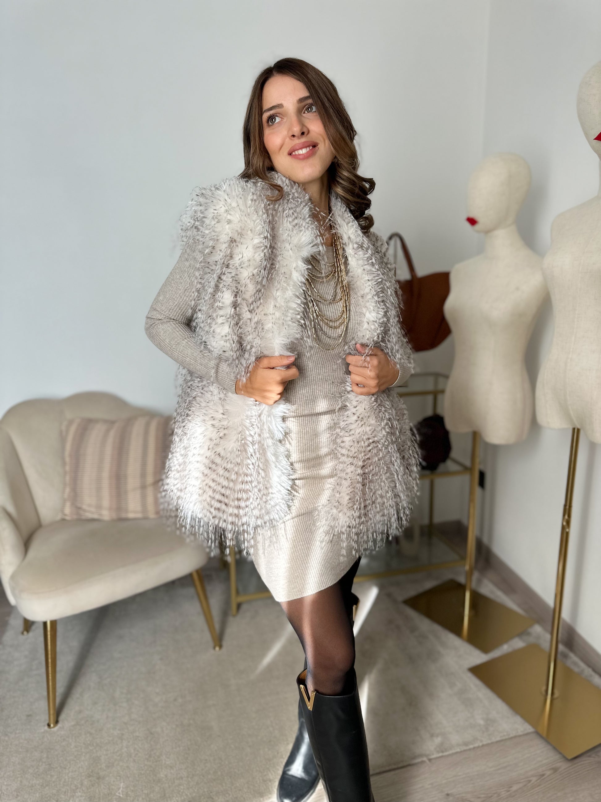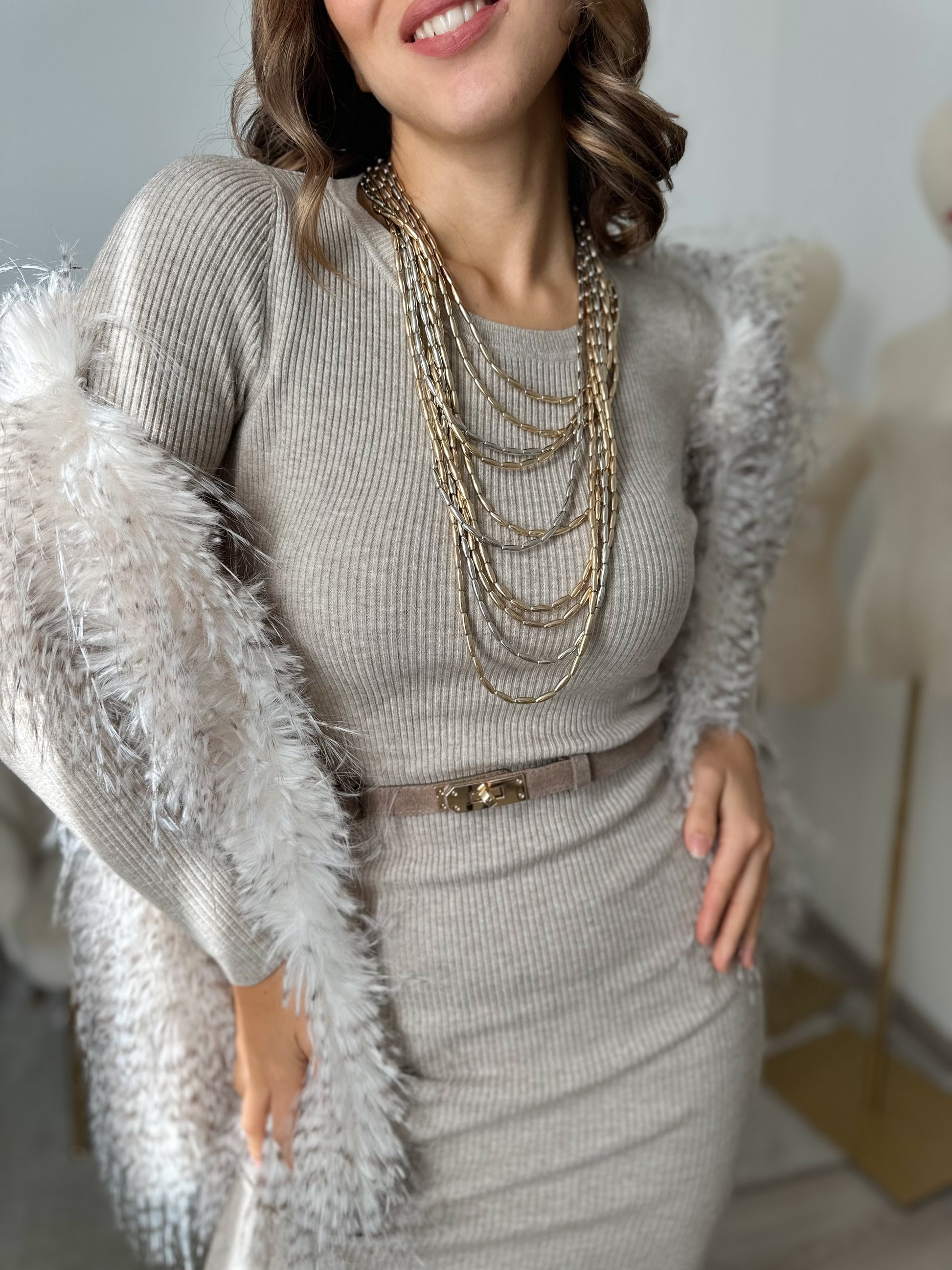 Abito girocollo, corto, in maglia a costine nella colorazione beige.