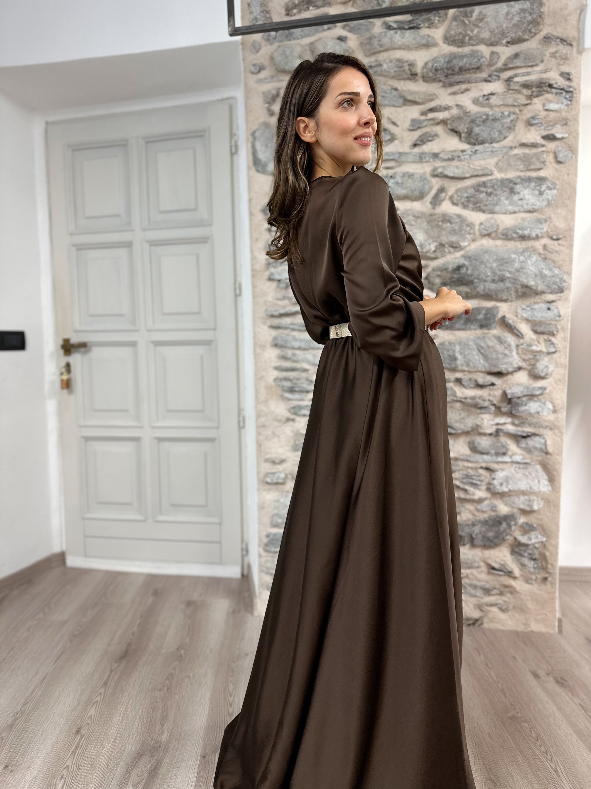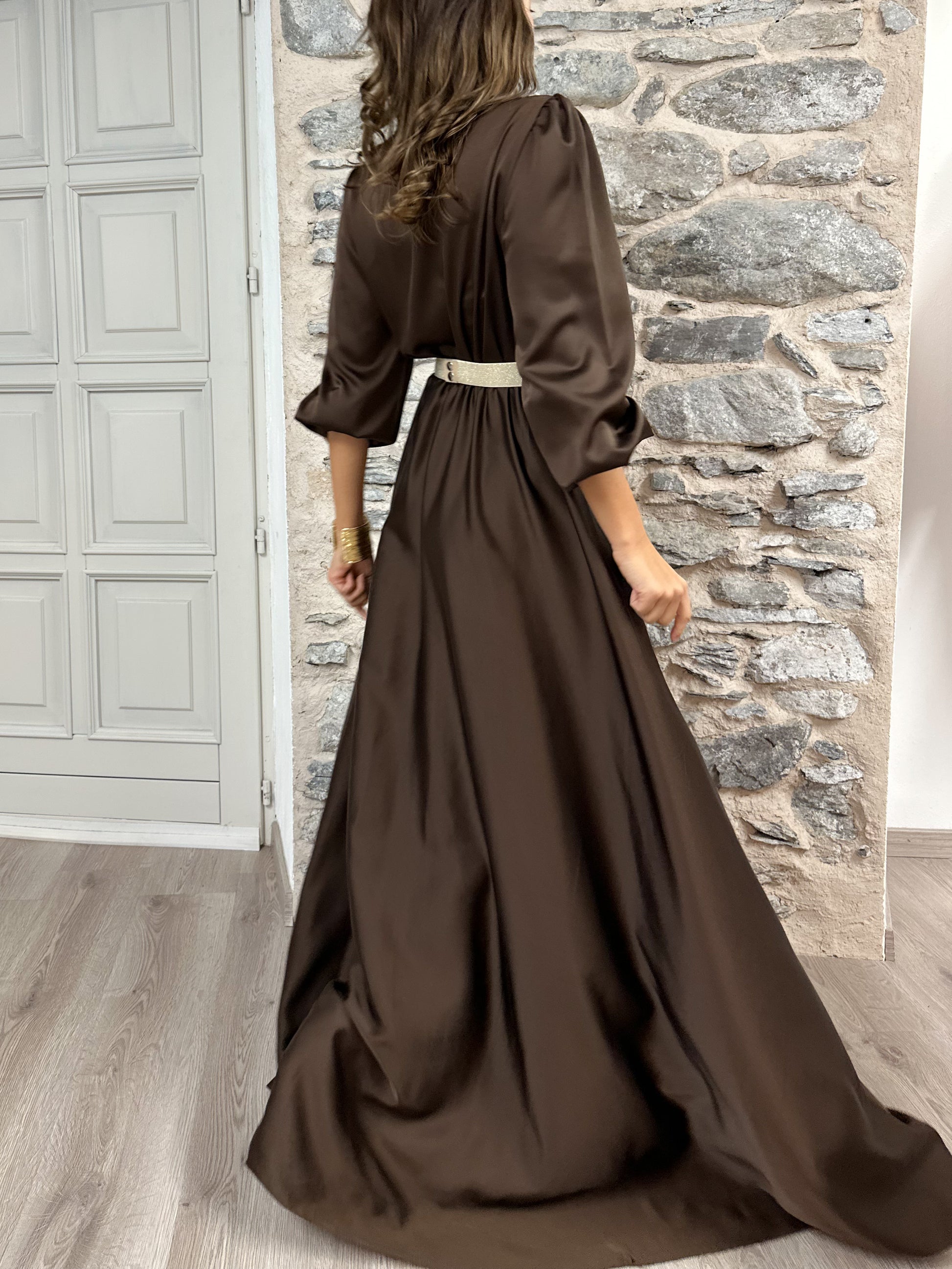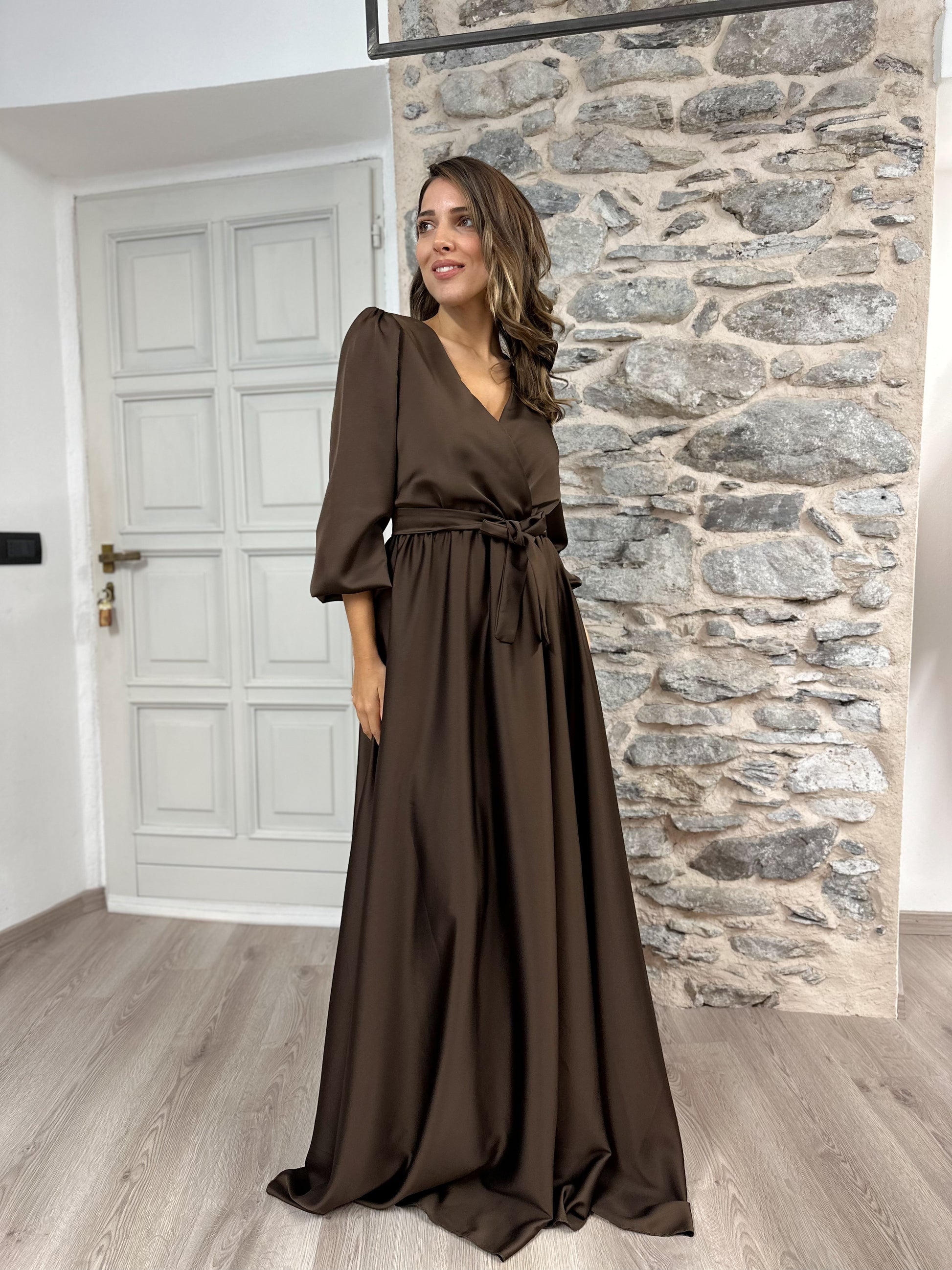 Abito con manica lunga, sbuffo sulle spalle e scollo a V incrociato