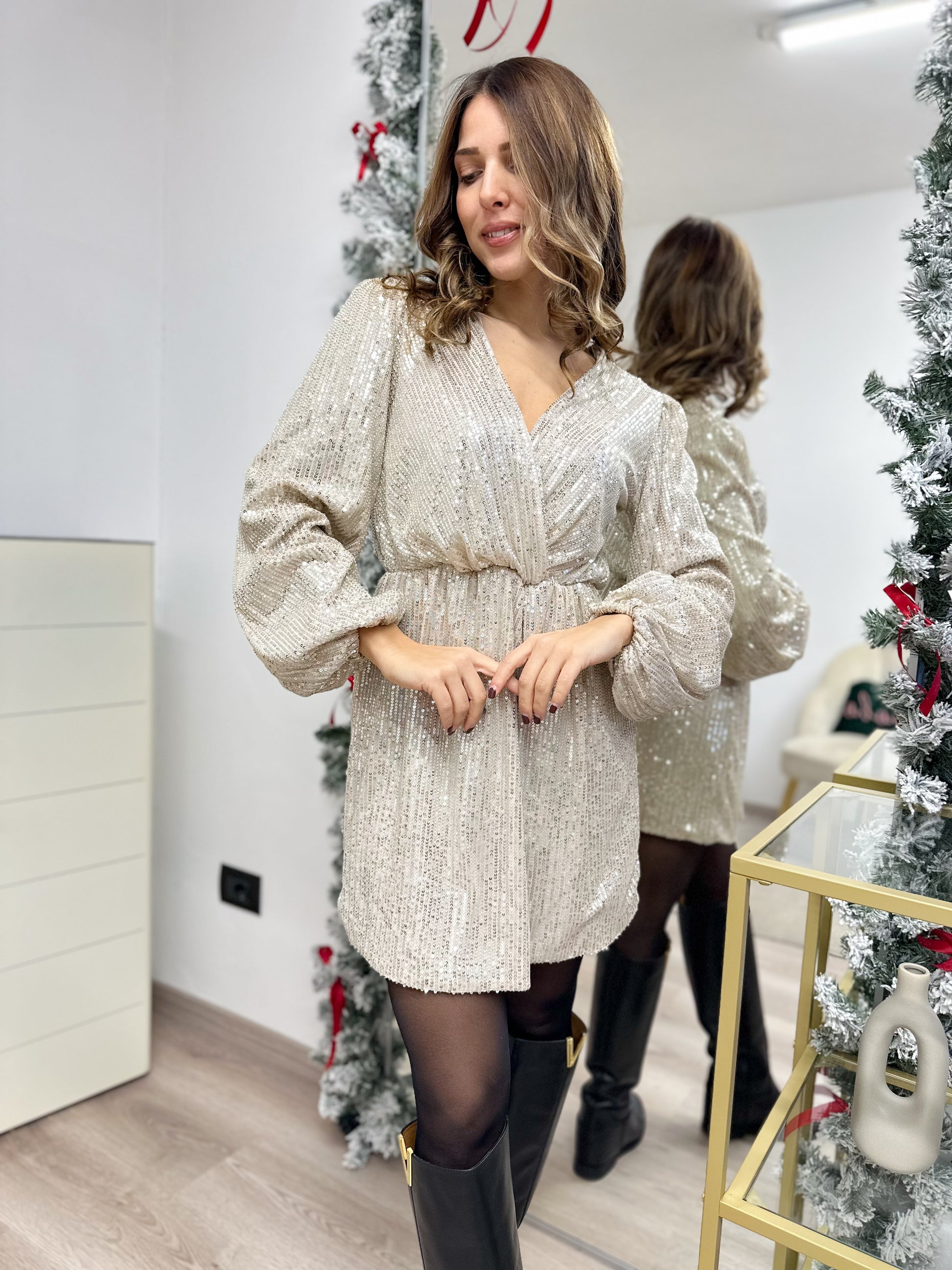 - Abito in paillettes scollo a V incrociato, manica ampia con elastico sul polso