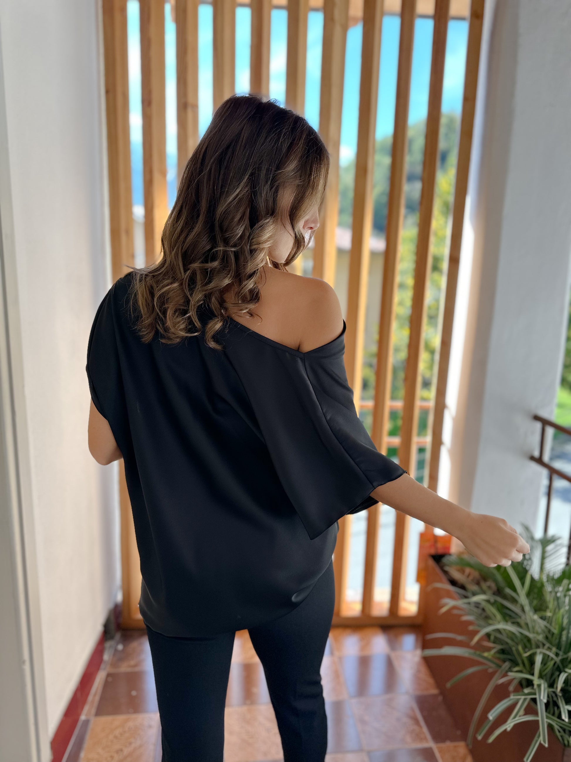 Blusa over con manica corto in raso e scollo a barchetta