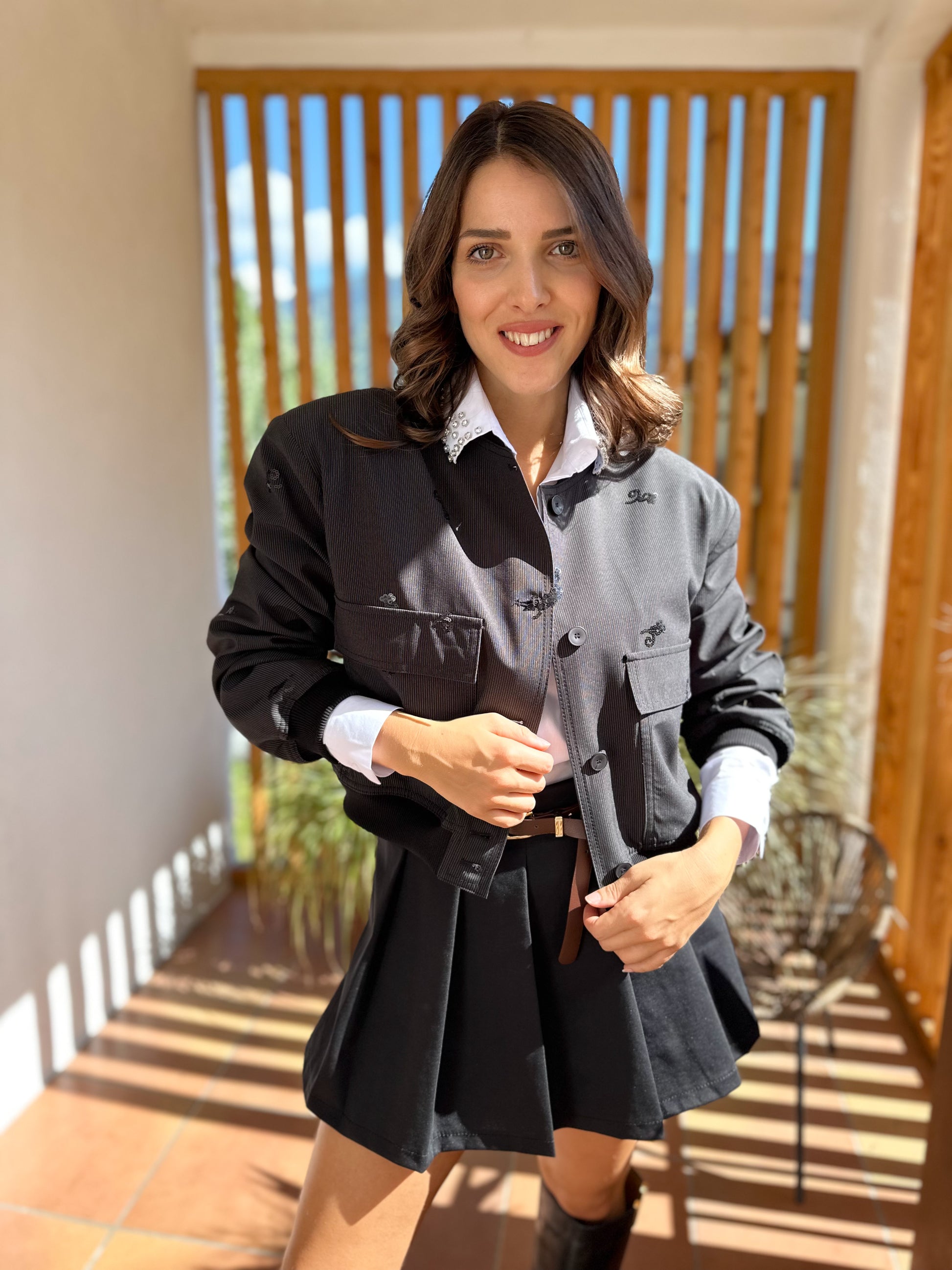 Bomberino gessato fit over con paillettes ricamate, spalle imbottite e fodera interna