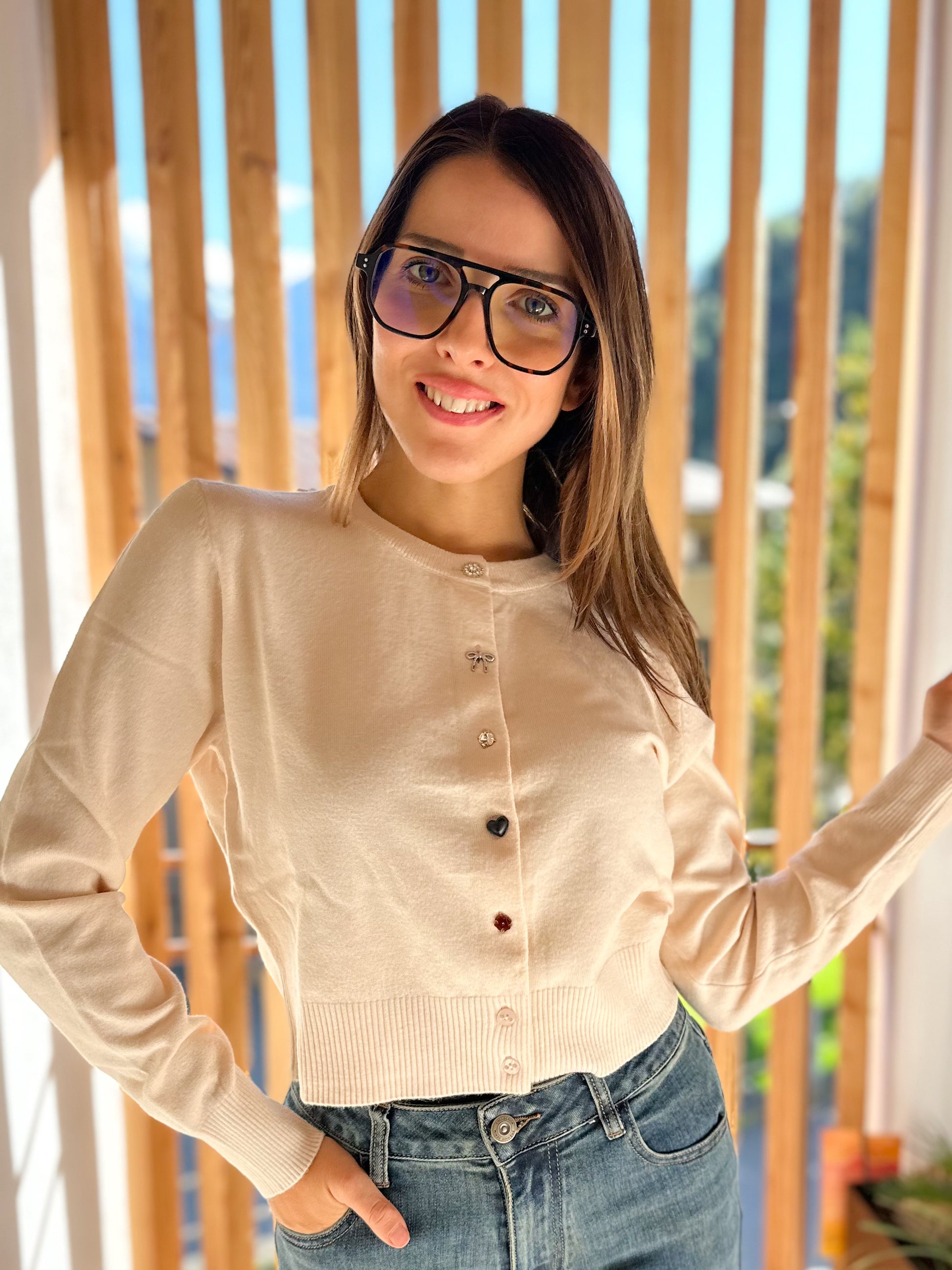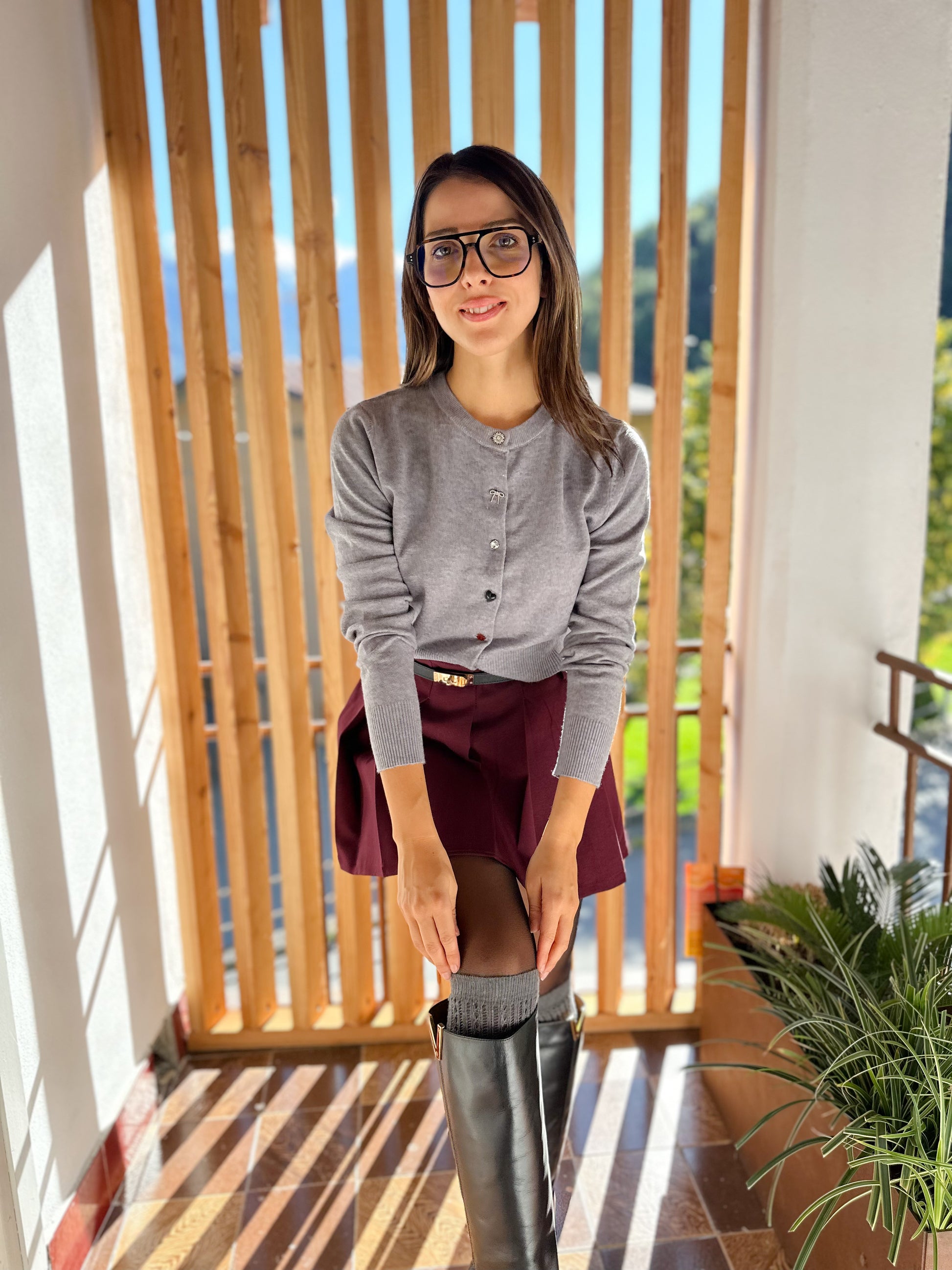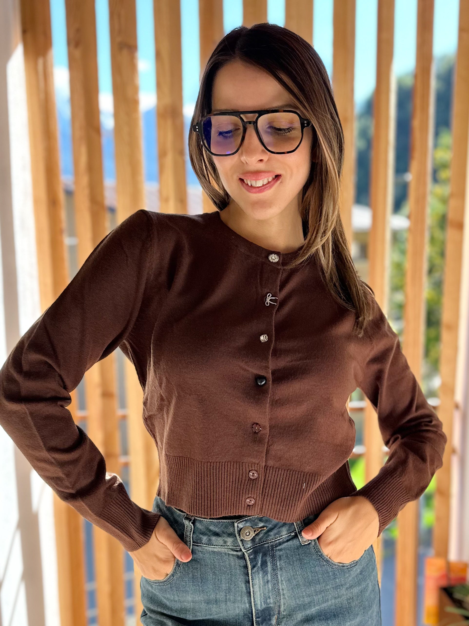 Cardigan che arriva all’altezza dell’ombelico da portare con capi a vita alta.