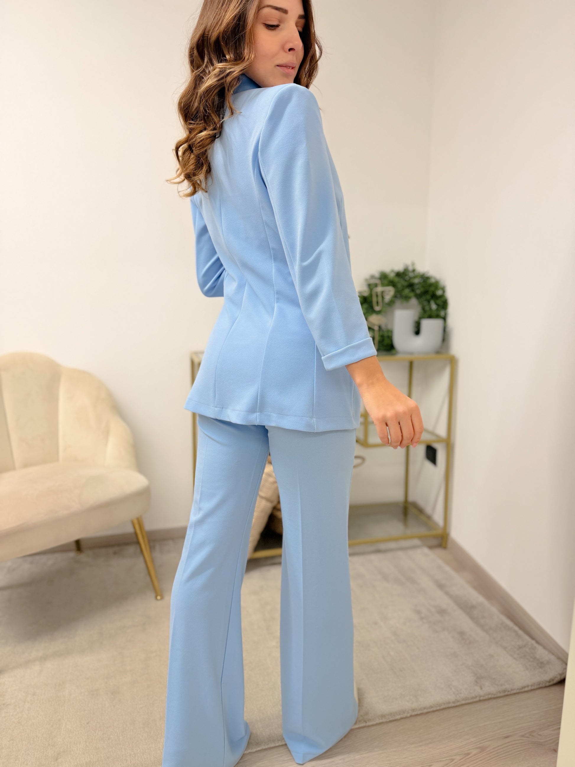 Completo in crepe elasticizzata con dettagli in raso su blazer e pantalone