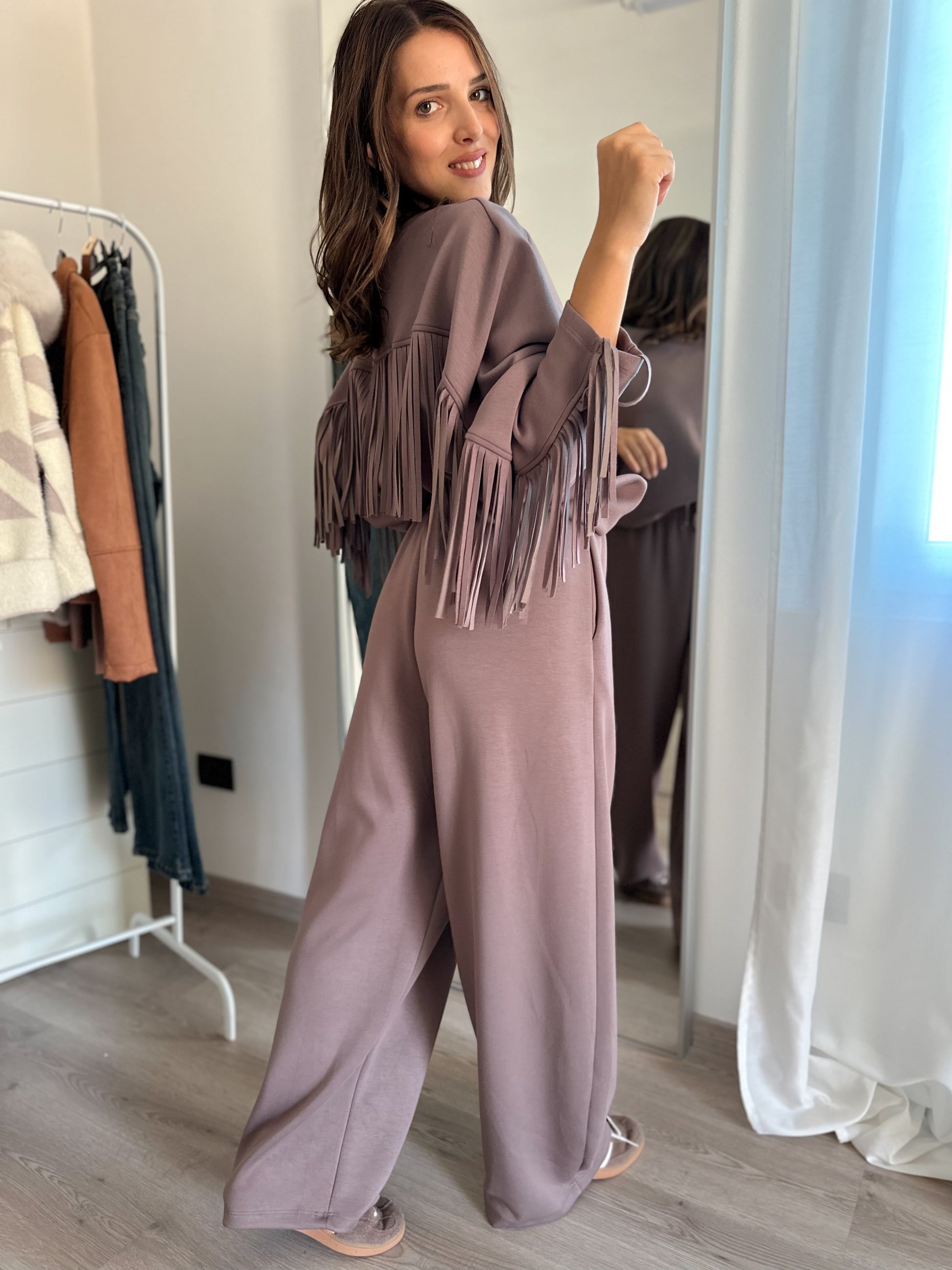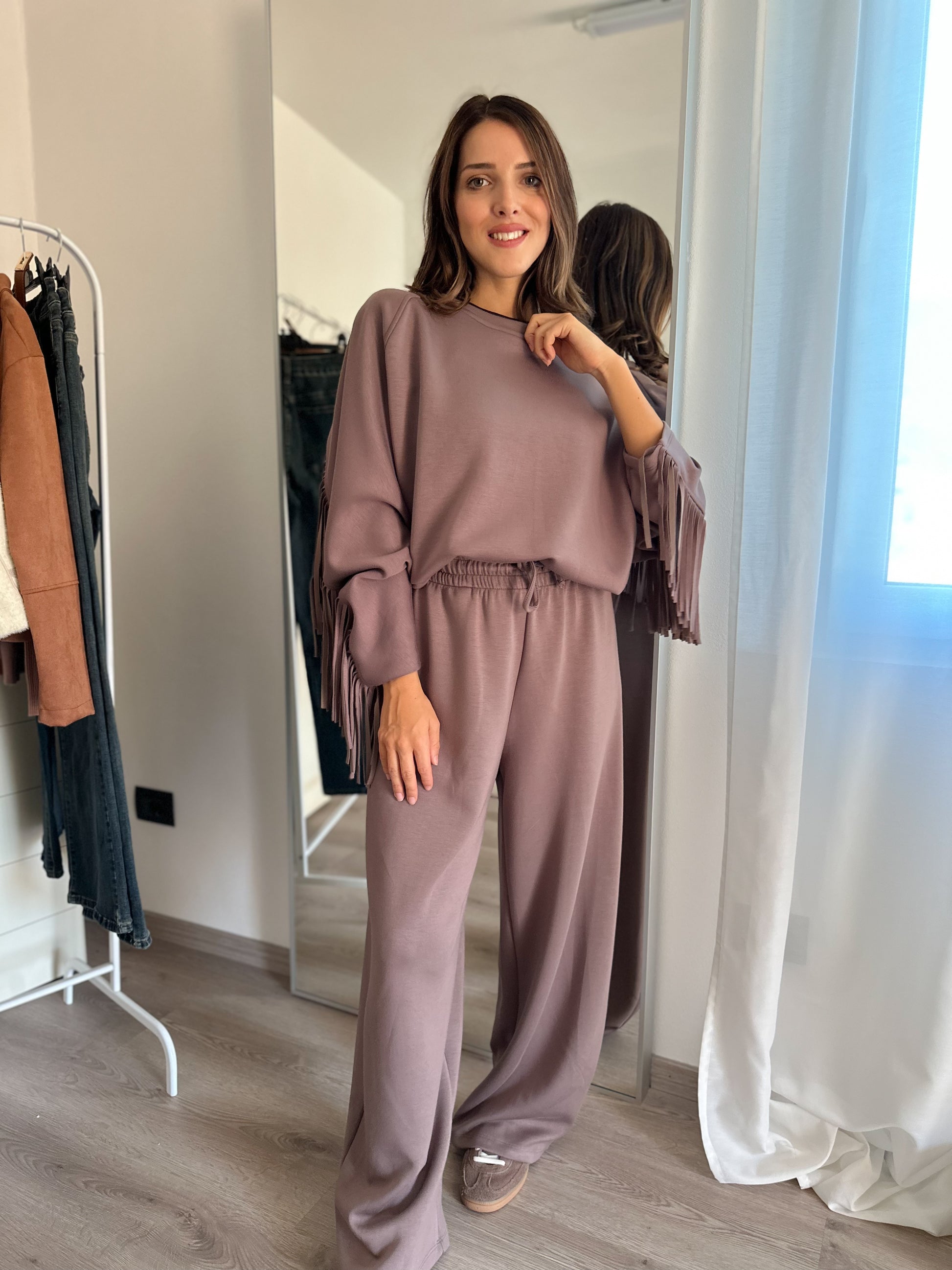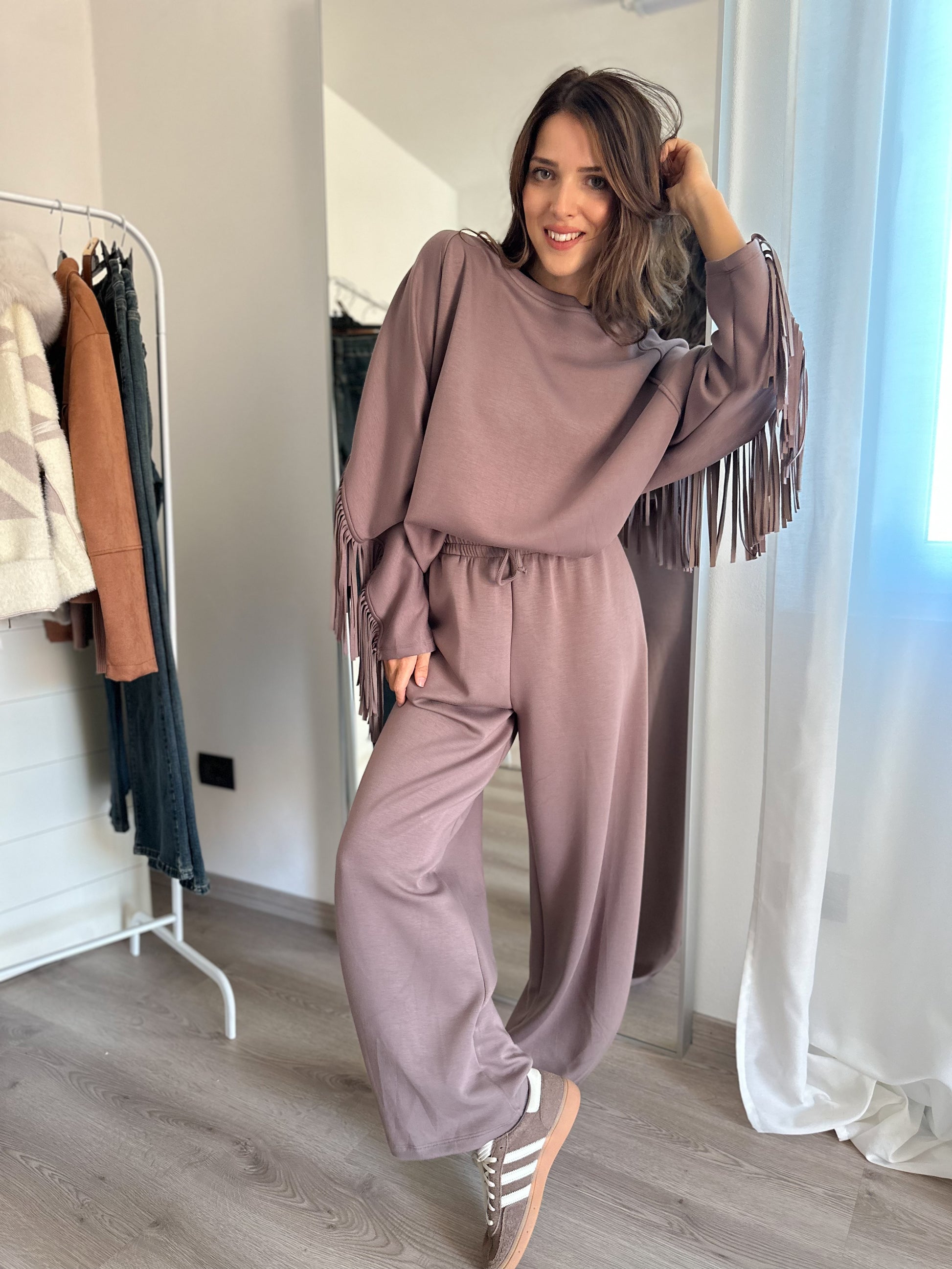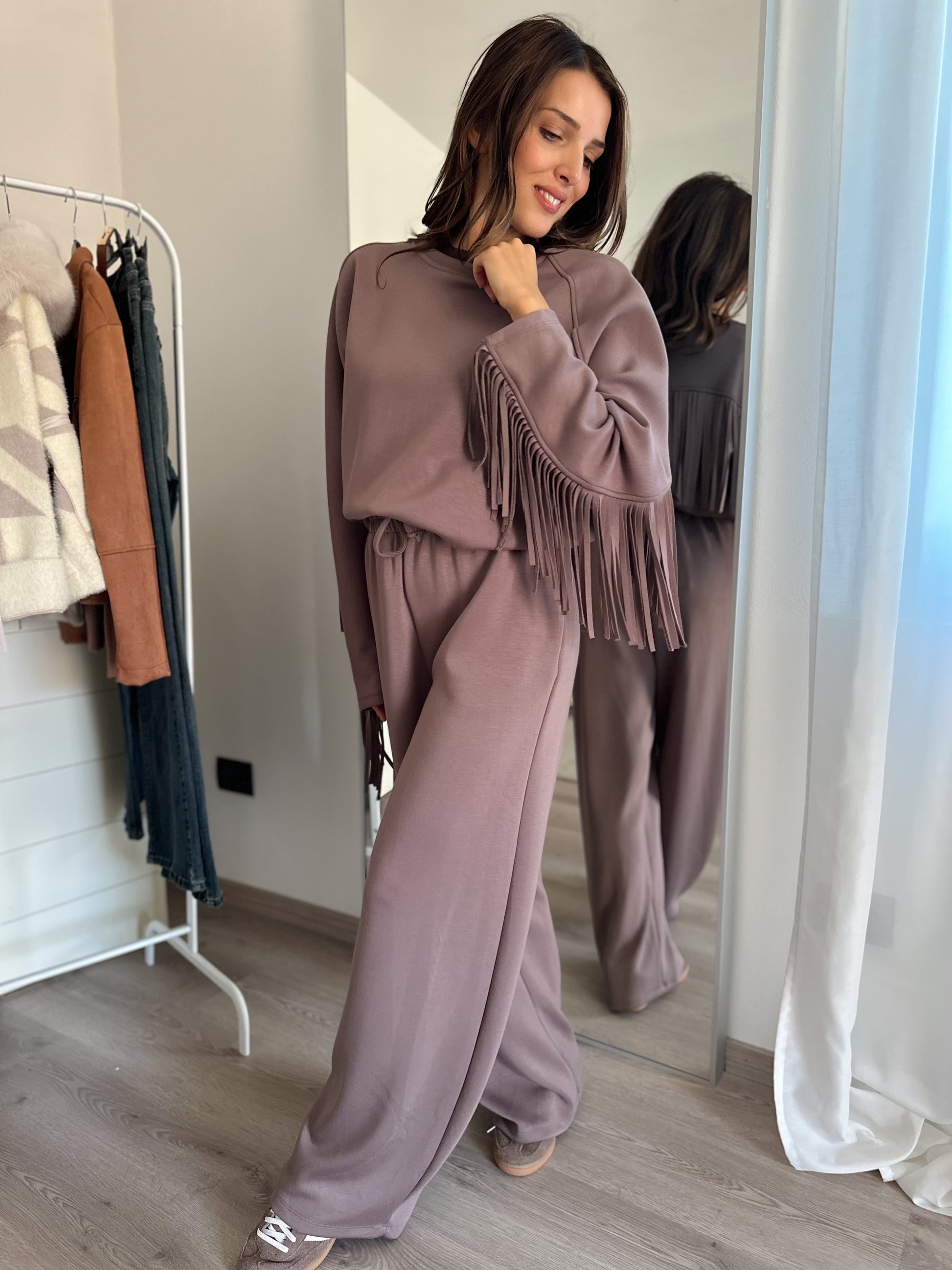 Felpa a morbida girocollo con manica lunga e frange sul retro e sulle maniche