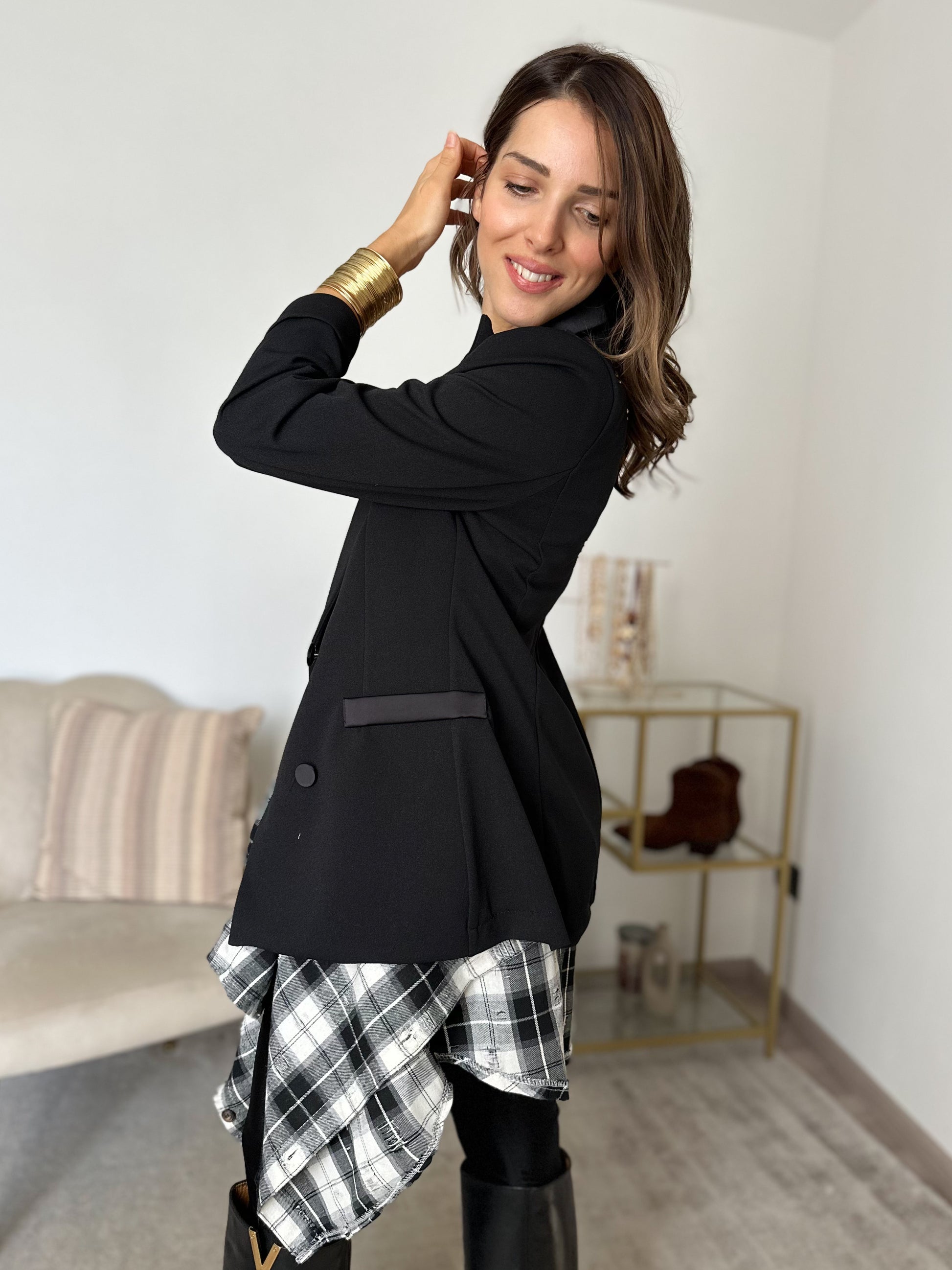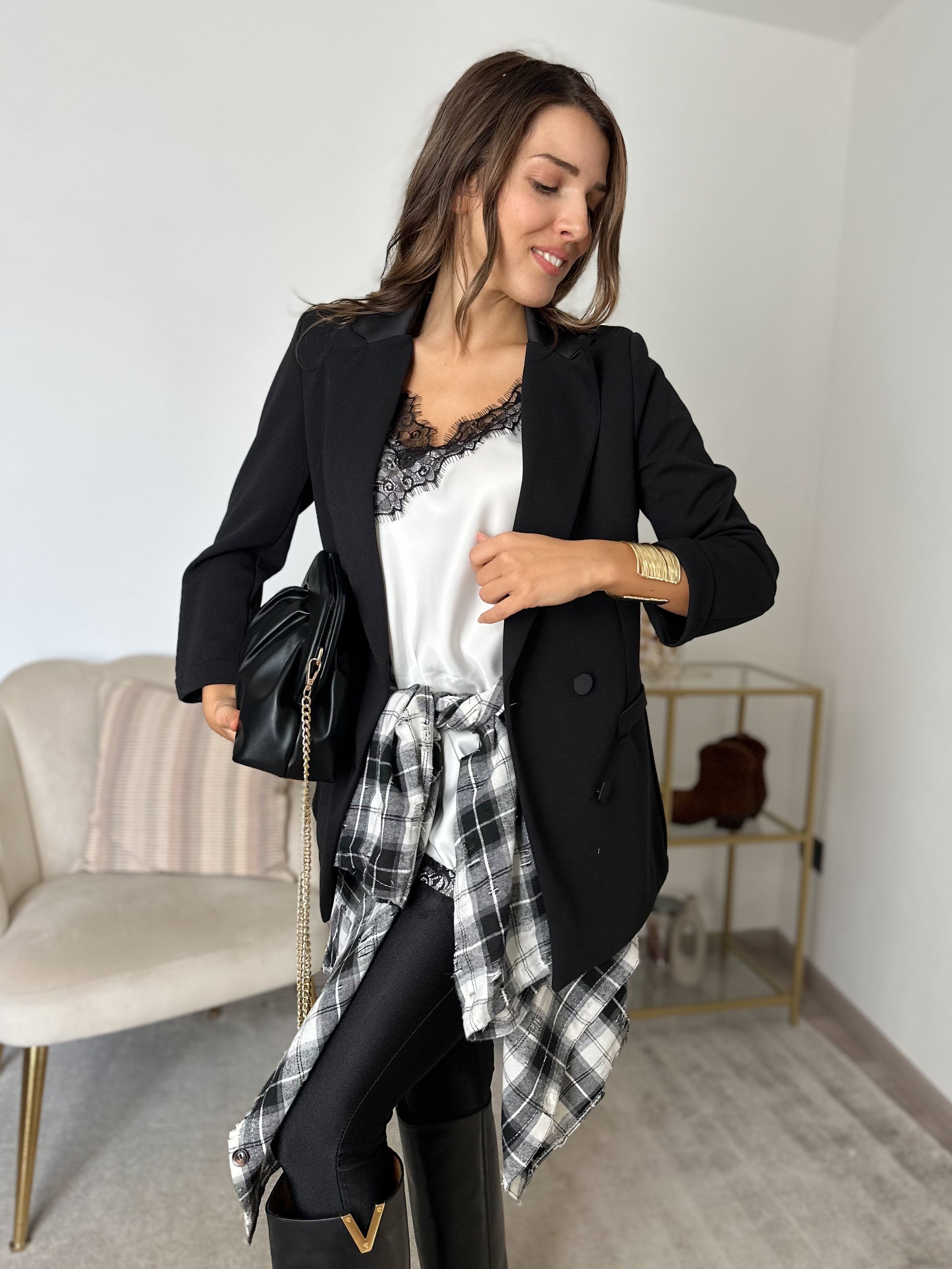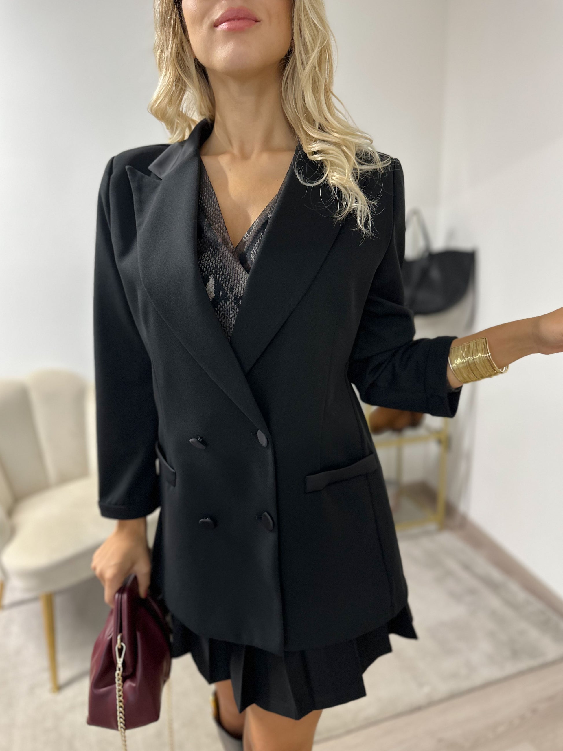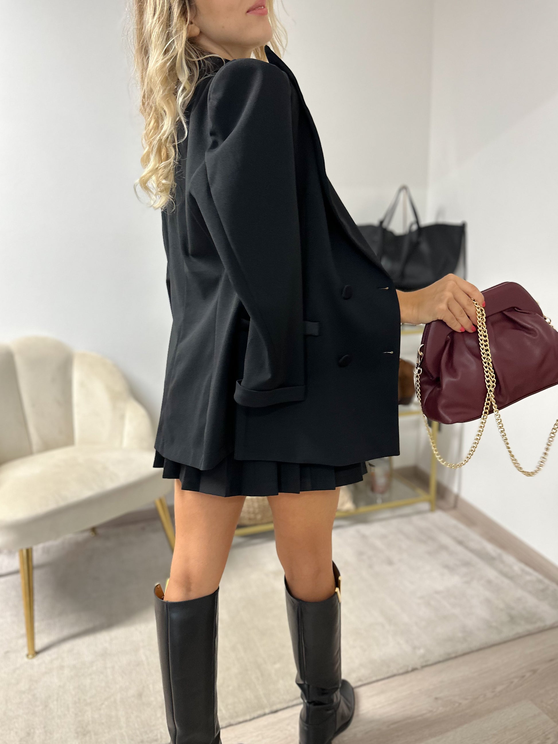 Spalle imbottite, dettagli in raso, chiusura doppiopetto