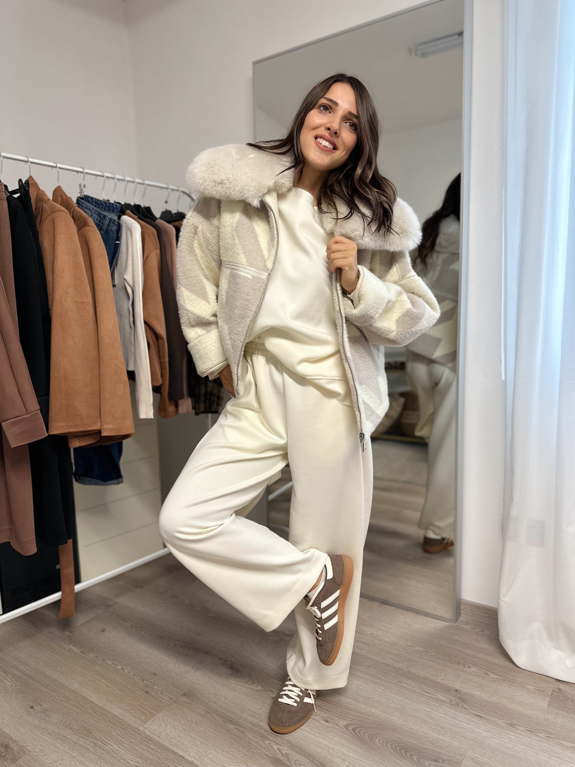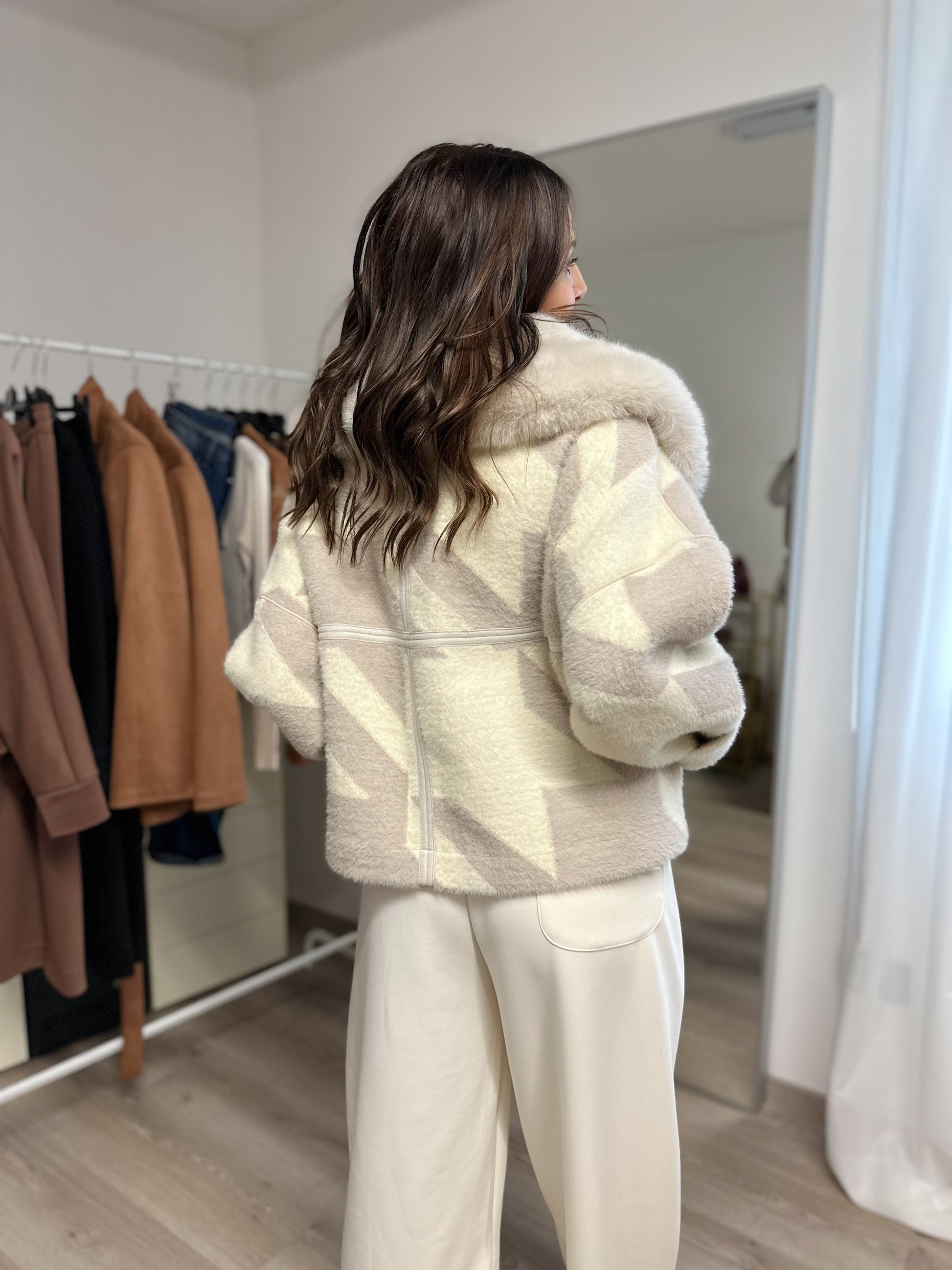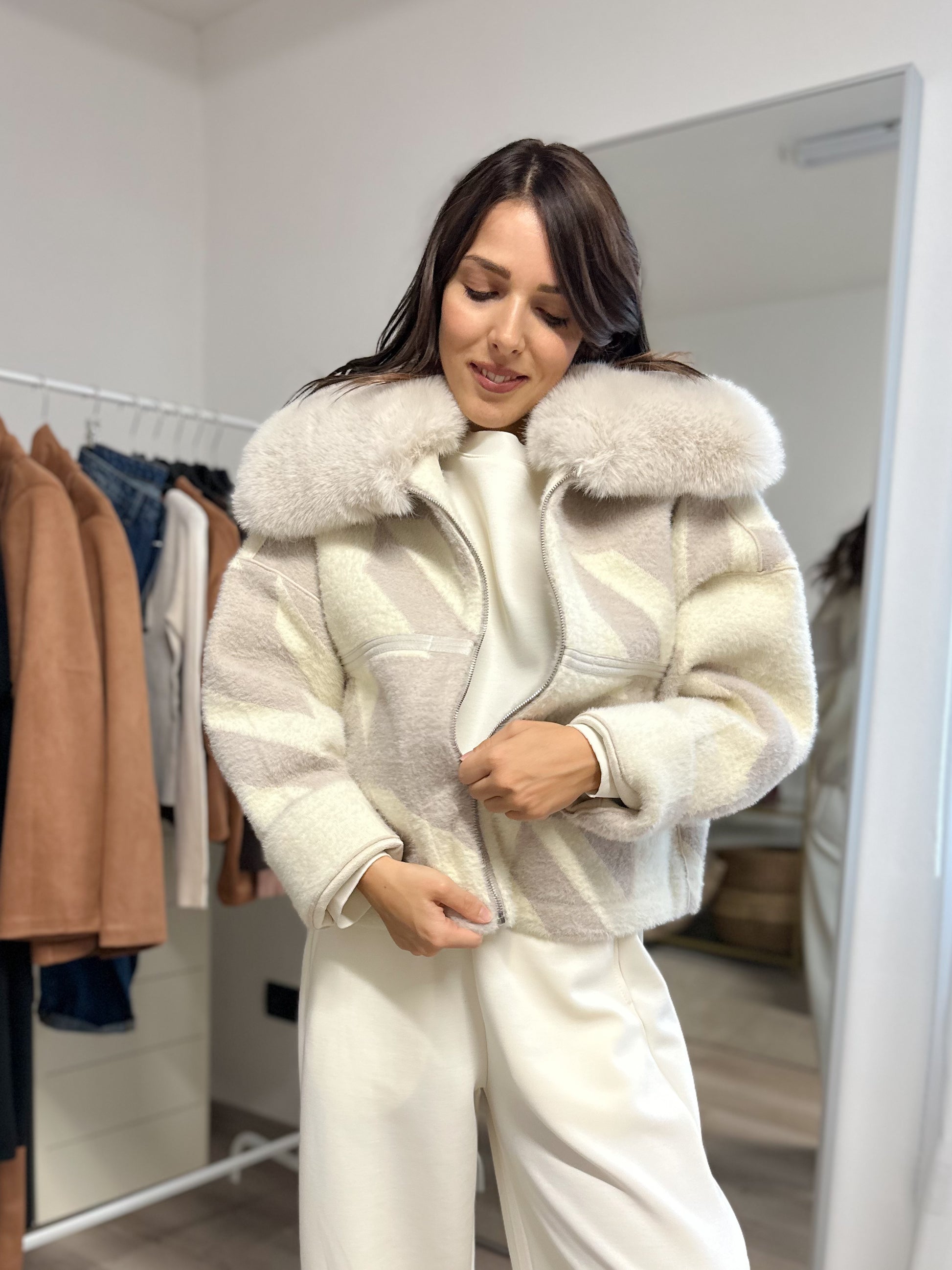 giacca double face con collo in ecopelliccia, chiusura con zip. Interno in tinta unita con fantasia sulle tasche esterno con fantasia in pied du poule fango.