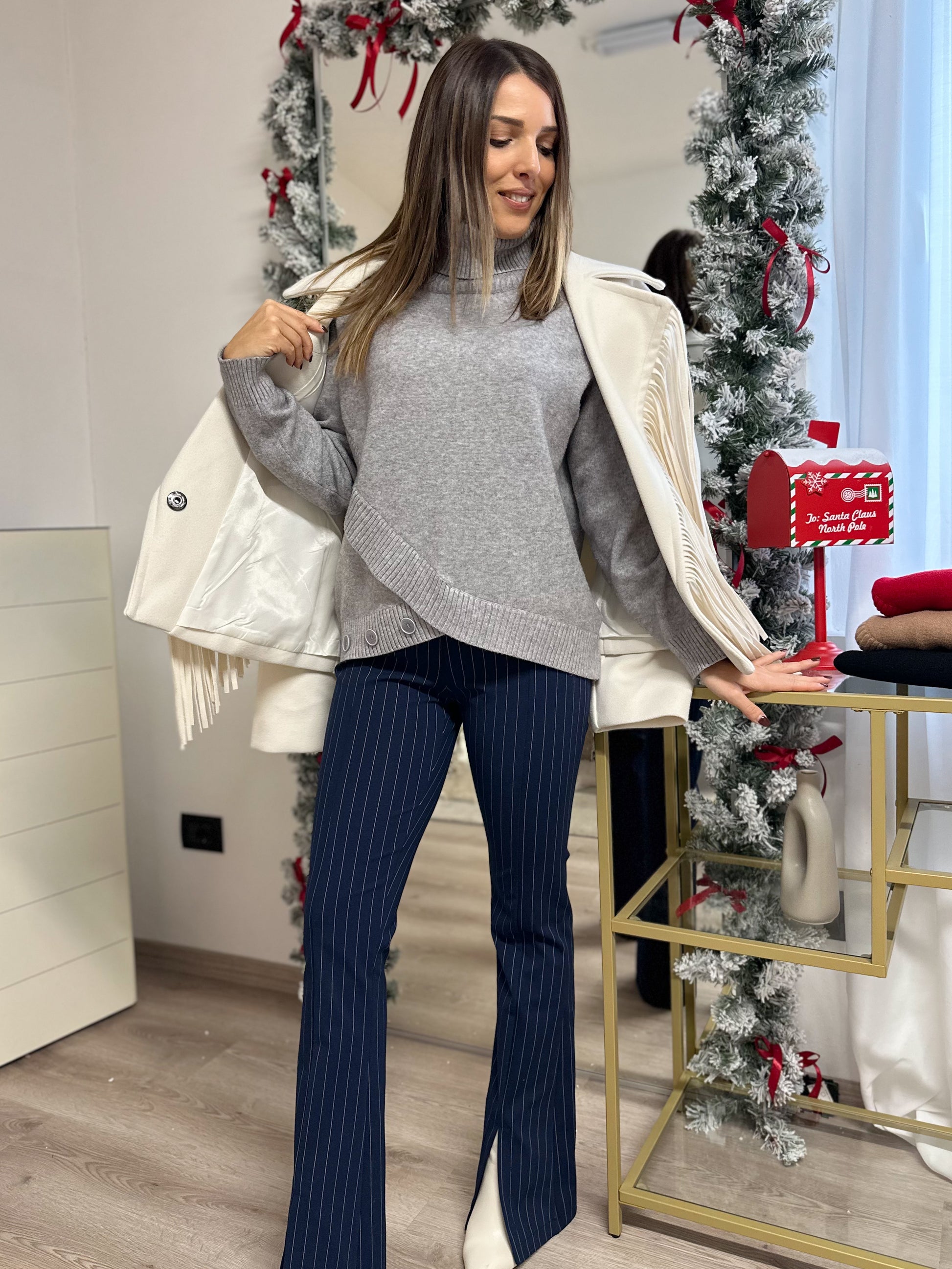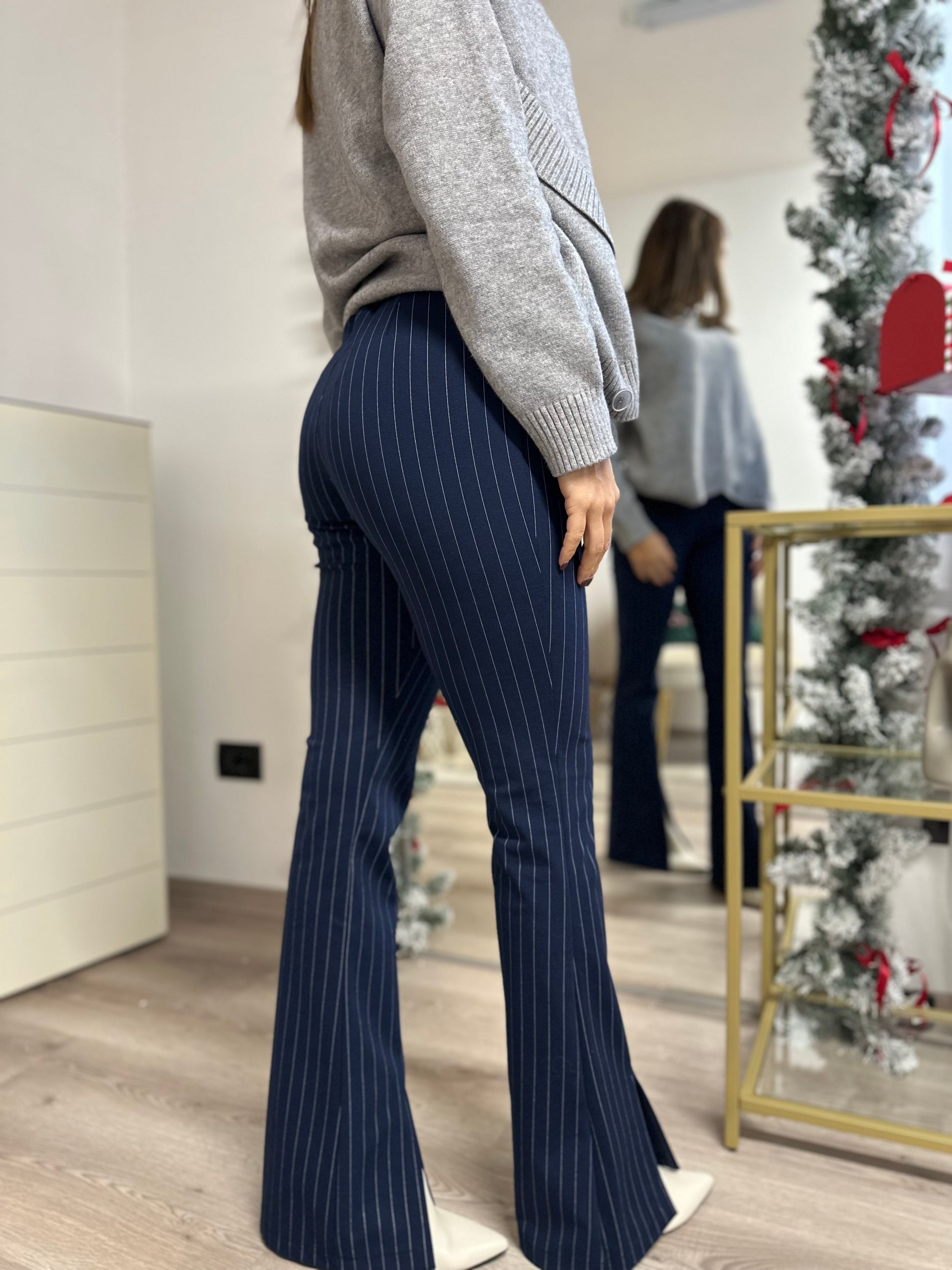 Pantalone flare gessato con spacchetti davanti.