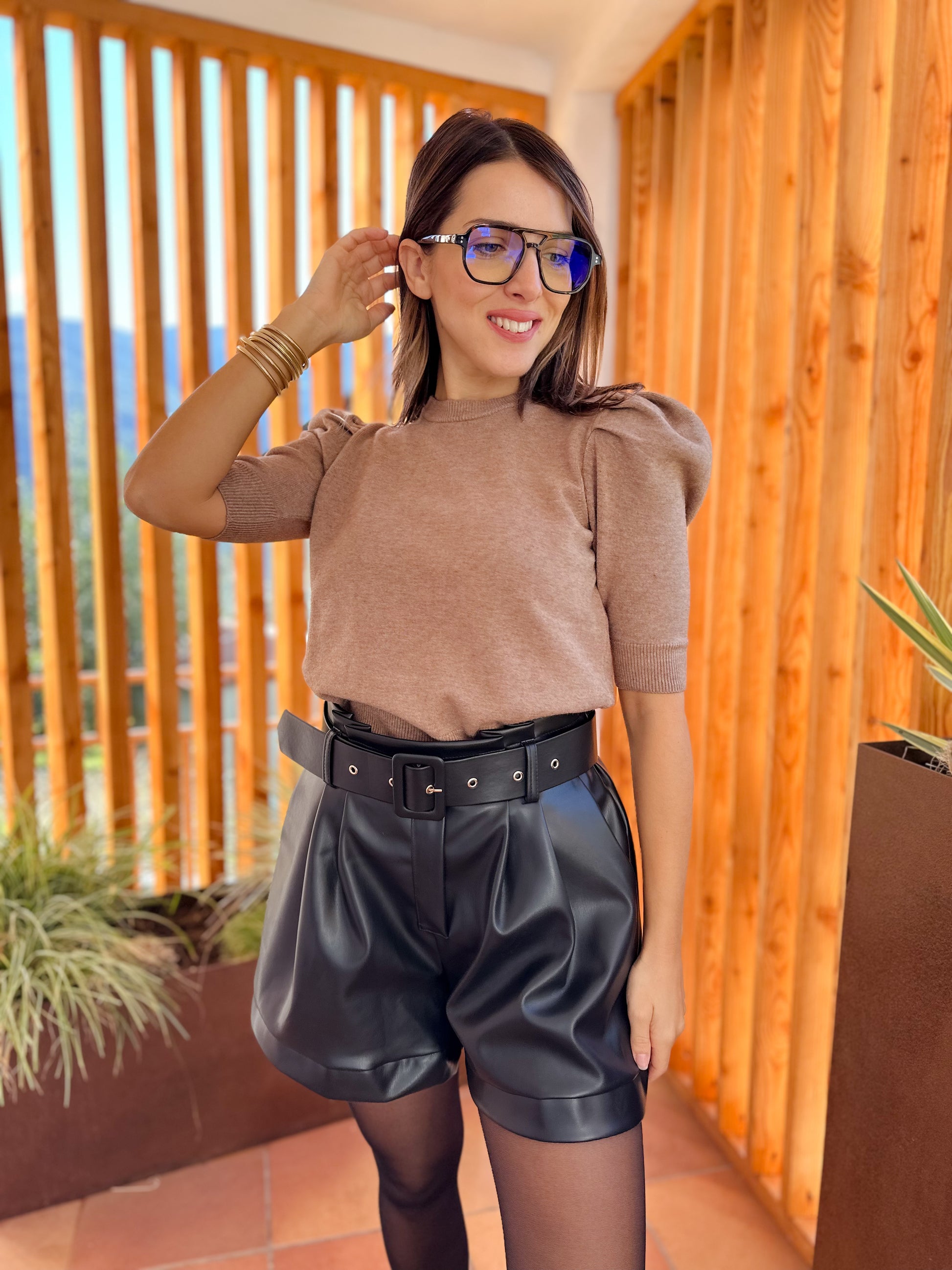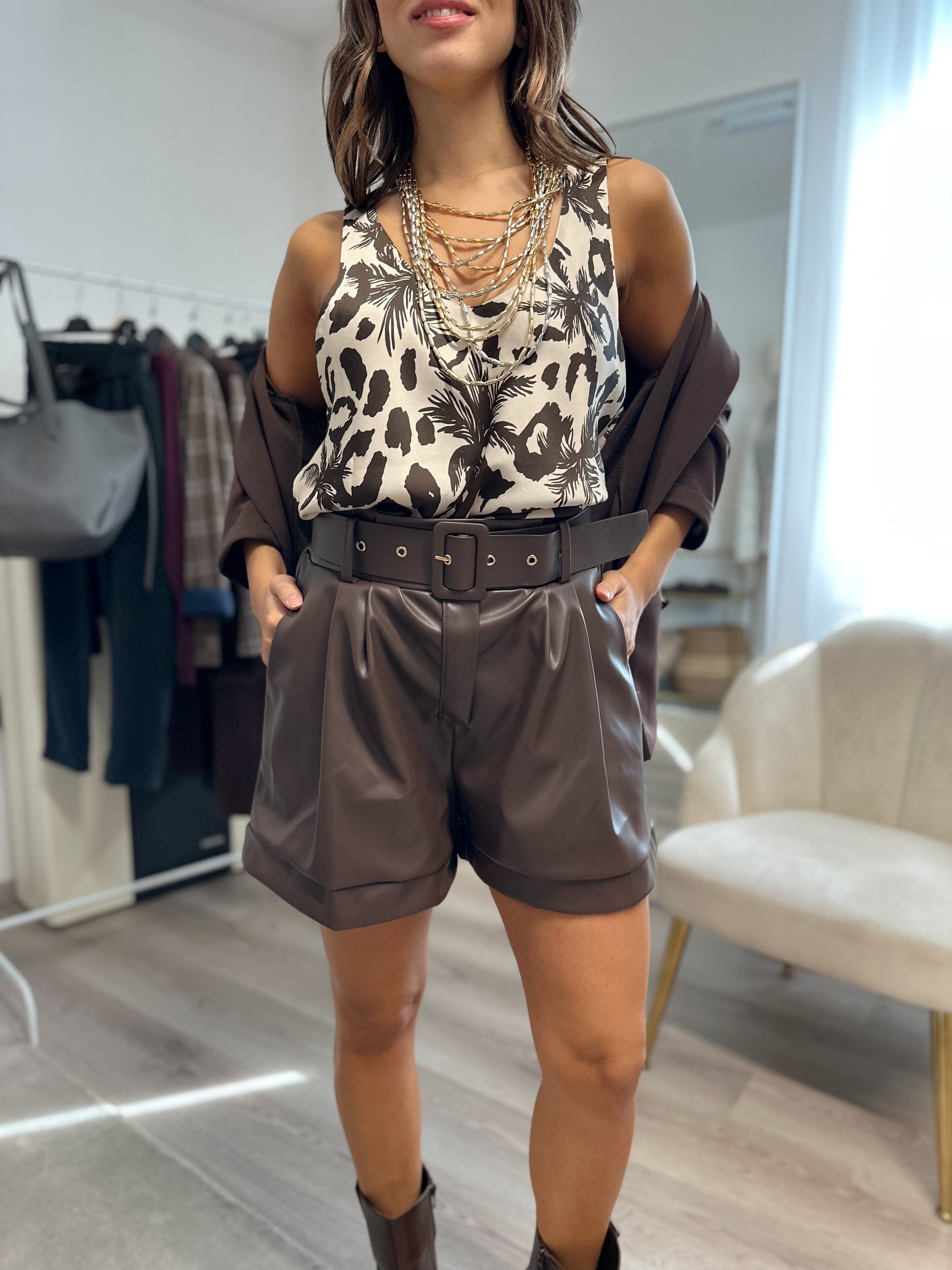 Short ecopelle vita a caramella con cintura regolabile e svasato sul fondo