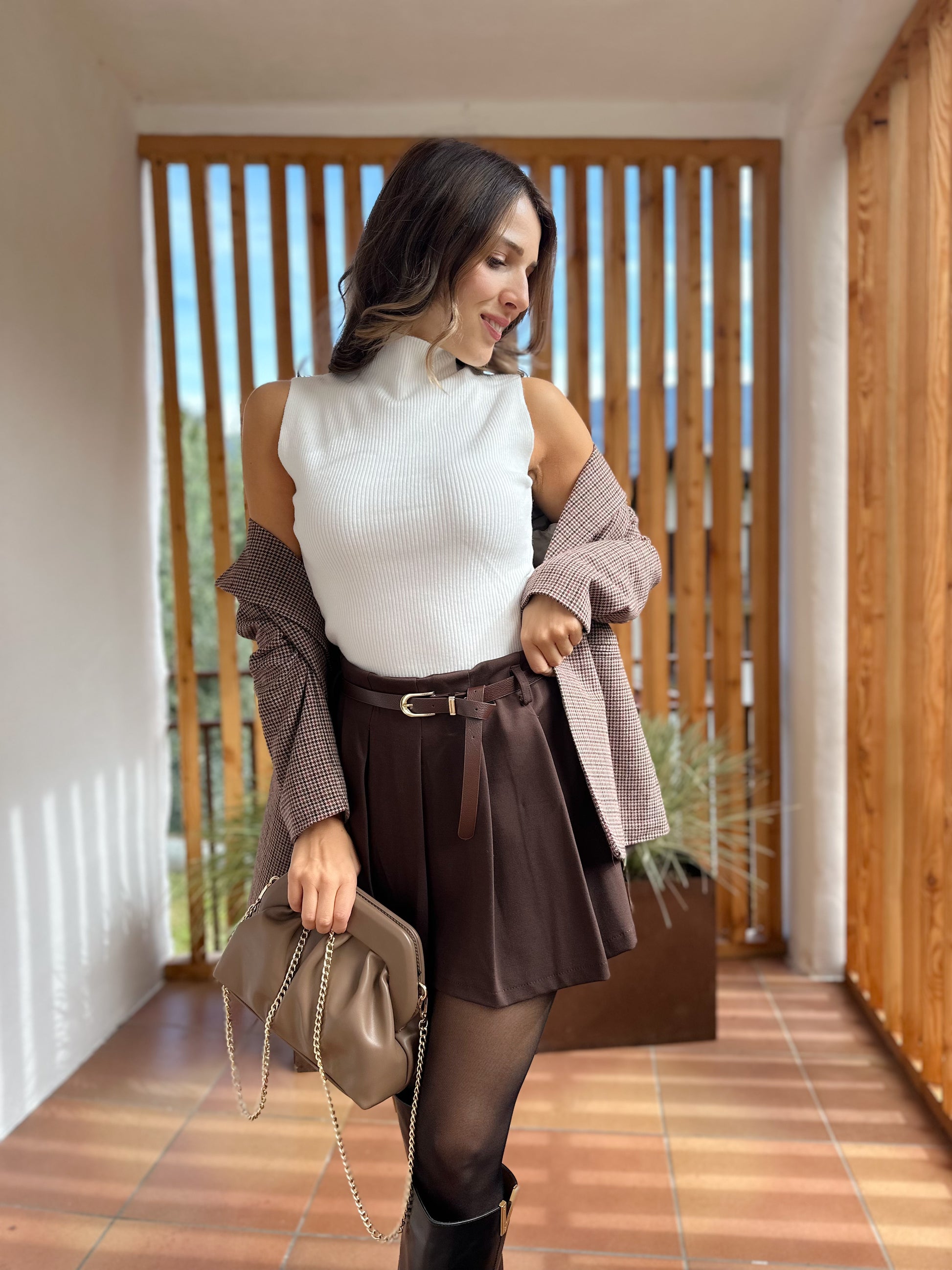 Lunga fino all’ombelico si presta per non creare volume all’interno di capi a vita alta