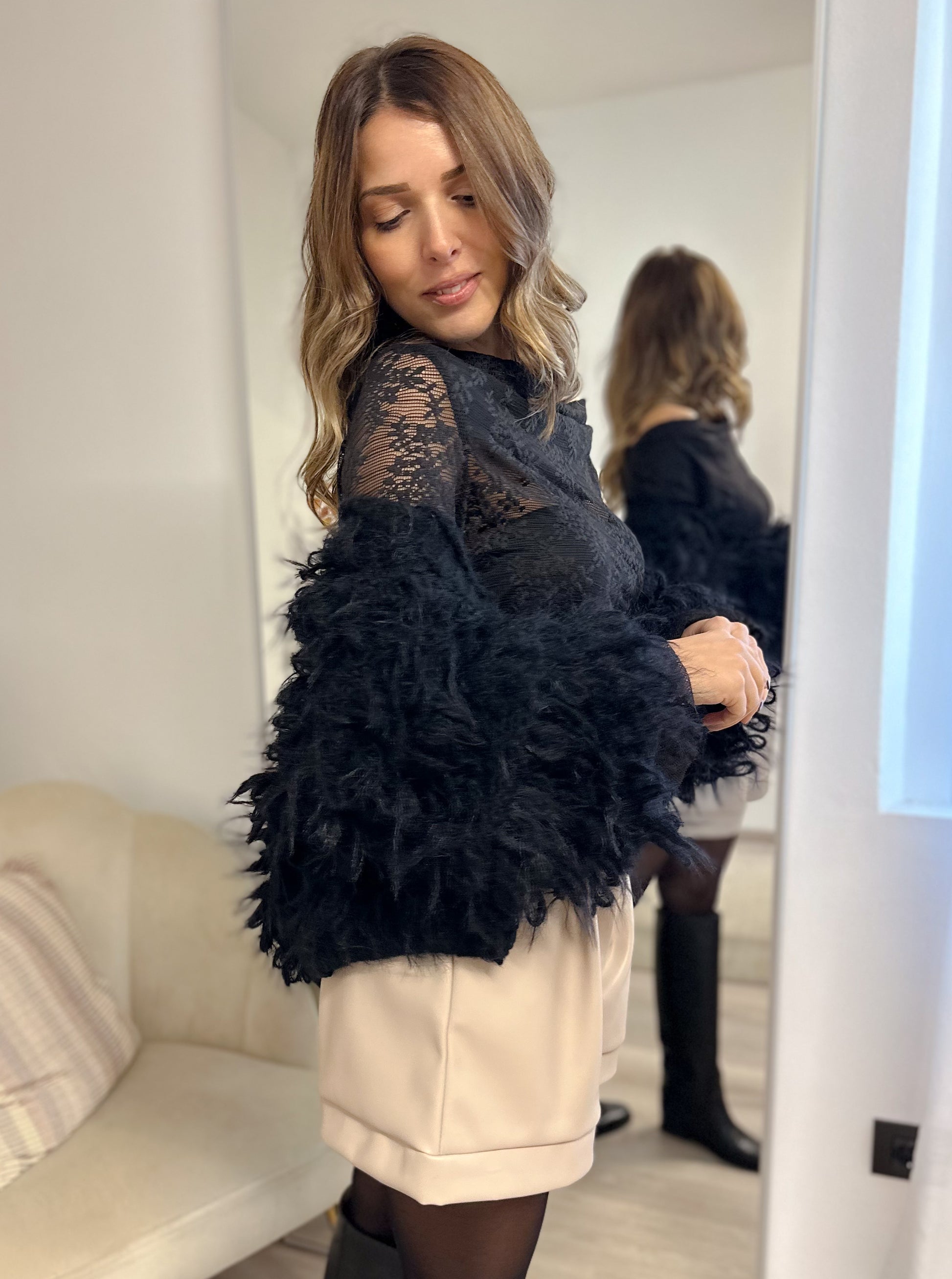 Top in pizzo con scollo a barchetta e manica a Campanella
