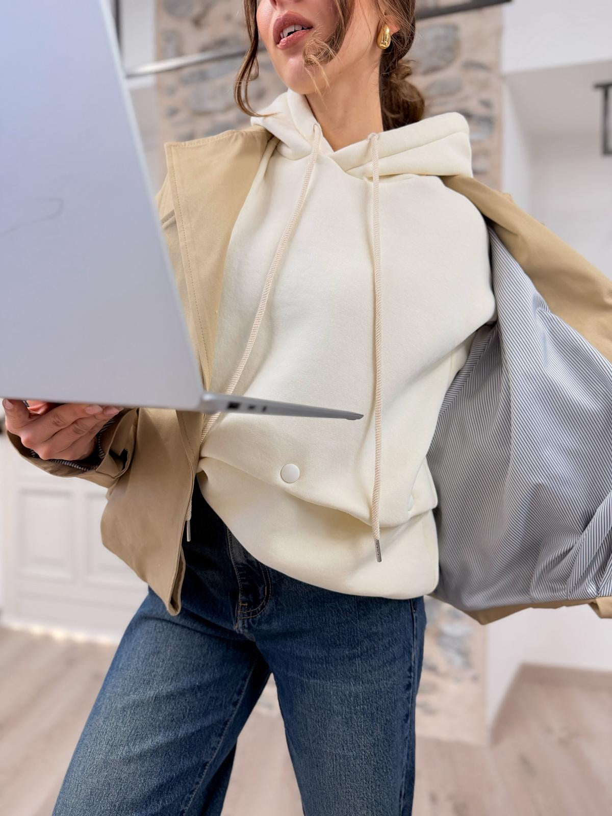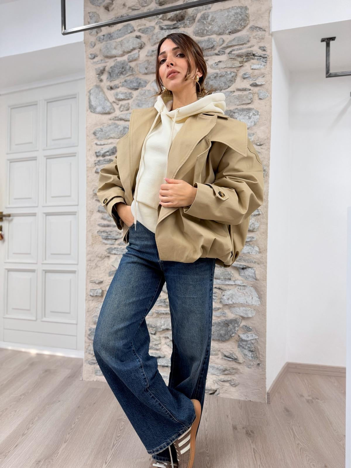 Dettaglio doppio collo a revers. Bottoni nascosti e tasche a filetto. Arricciatura sull'orlo e fodera all'interno.